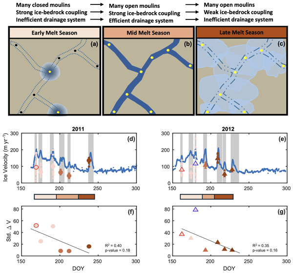 We characterize the magnitude and variability of transient speed-ups across a Global Positioning System (GPS) array in western Greenland in 2011 and 2012. While we find no relationship between speed-up and runoff, late-season events have larger speed-up amplitudes and are more spatially uniform compared to early season events. These results reflect an evolution toward a less efficient drainage system late in the melt season, with a pervasive system of open surface-to-bed conduits.