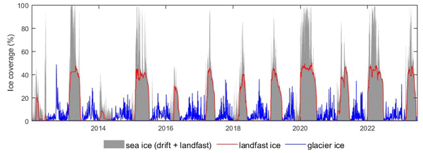 Drift, landfast and glacier ice are present in fjords and it is important to map them separately. We developed a method to split fjord ice into different types based on ice location, persistence in time and size. We used this method for Hornsund fjord, home to the Polish Polar Station, for an 11.5-year period. We observed that most of the ice is drift ice. The maps produced by this study can be used to look at water circulation, coastal erosion and habitat conditions.