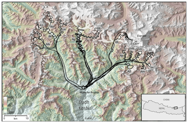 We present a new and uniquely extensive dataset of glacier thickness from the Khumbu Himal around Mount Everest that stretches for 119 km, doubling the extent of thickness measurements in High Mountain Asia. Such measurements are key inputs for models that estimate how much ice is stored on the whole mountain range scale and for models that predict how this ice reserve will change in future, and what impact this will have on water supply for the large populations living downstream.