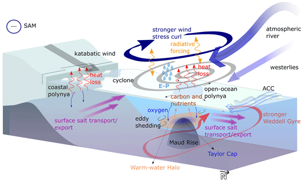 Polynyas are large openings in polar sea ice that can influence global climate and ocean circulation. After disappearing for 40 years, major polynyas reappeared in the Weddell Sea in 2016 and 2017, sparking new scientific questions. Our review explores how ocean currents, atmospheric conditions, and deep ocean heat drive their formation. These polynyas impact ecosystems, carbon exchange, and deep water formation, but their future remains uncertain, requiring better observations and models.