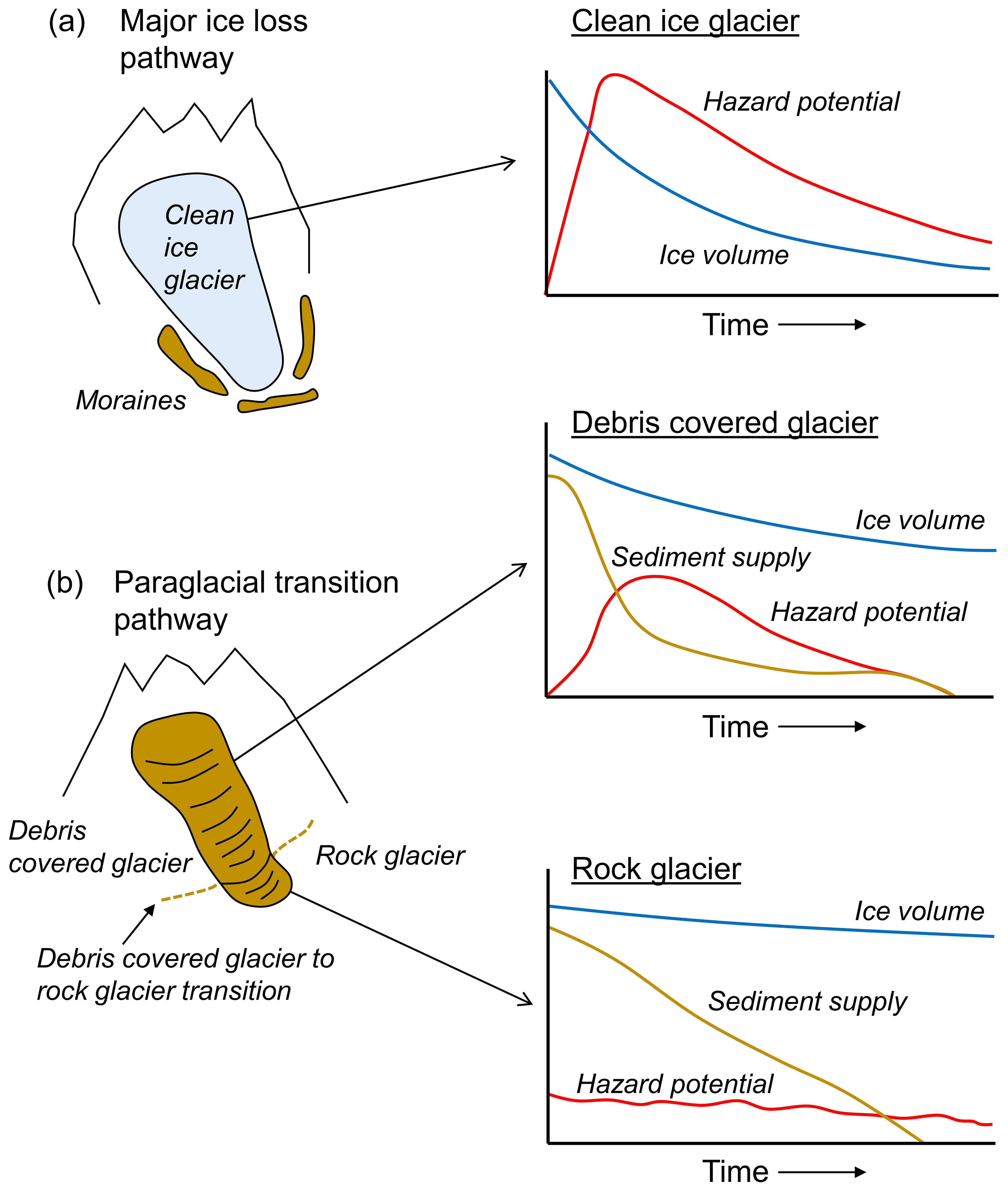 This paraglacial path might result in a decreased GLOF hazard risk over time but an increased rock slope failure hazard. There may be some lakes impounded by rock glaciers, but these would be expected to drain slowly rather than catastrophically given the armoured nature of the rock dam comprised of rock debris. Thus, the nature of geomorphic and hydrological hazards is somewhat different between the MIL and PT pathways, and this in itself may help us understand which glaciers are following which evolutionary pathway. Here, GLOFs and LLOFs may also represent paraglacial landscape responses, where, instead of meltwater passively draining away under low hazard risk (MIL response), it is impounded by paraglacial landslides that result in high hazard risk (PT response).