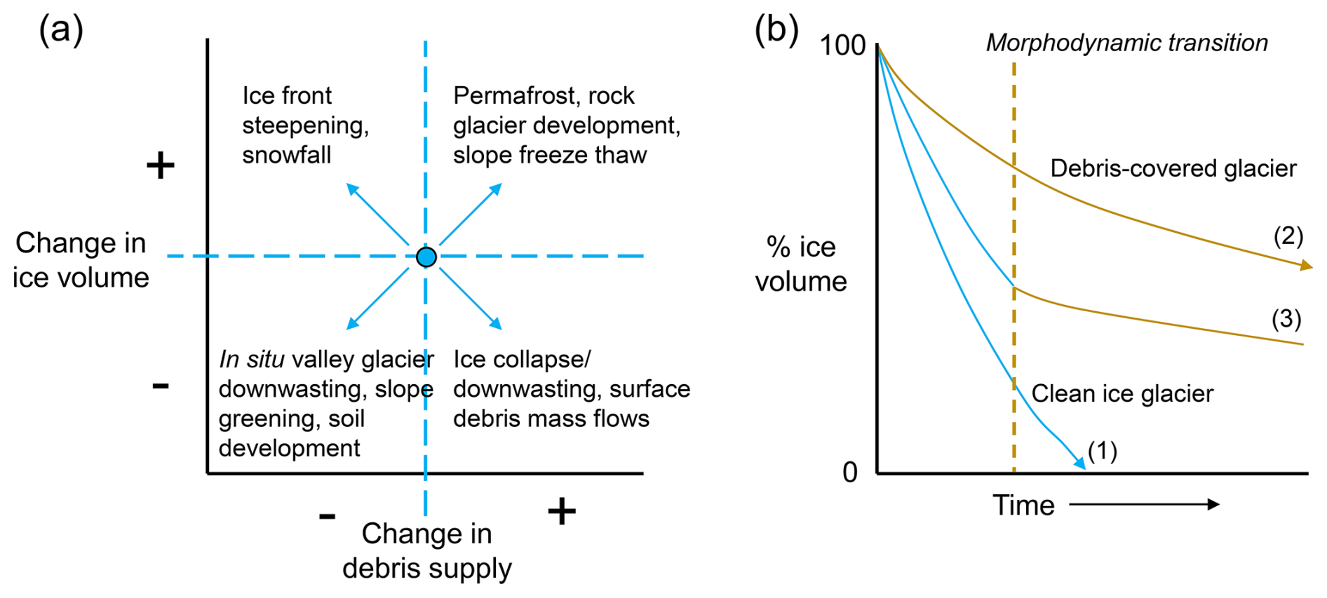 Figure 3(a) Model of HMA glacier development as a consequence of certain changes in ice volume vs. changes in debris supply to/from the glacier surface. From an initial starting point (blue circle), changes in ice volume and debris (blue arrows) are associated with certain glacier properties and processes that suggest the likely ways in which these glaciers will develop in future. The dashed blue lines represent zero balance in ice volume and debris supply. (b) Representation of the different trajectories of changes in ice volume over time between (1) a clean-ice glacier (rapid melt), (2) a debris-covered glacier or rock glacier (slower melt), and (3) a scenario where a clean-ice glacier starts melting but is then covered by debris, such as from a paraglacial landslide, that then slows down the ice melt. Such an event represents a morphodynamic transition in the response of such a glacier to climate forcing.
