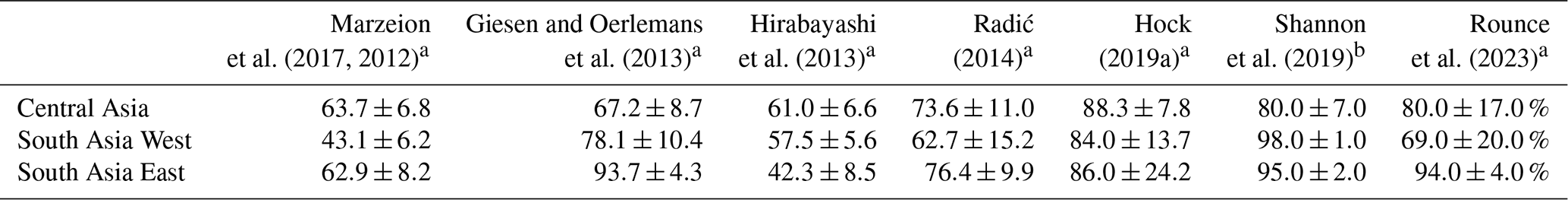 Table 1Examples of projected relative mass losses by the end of the 21st century for HMA, from different recent studies (reduction as a percentage of ice loss from 1990). Regions are defined as in the Randolph Glacier Inventory (RGI) v6 (first-order region, shown in Fig. 2). The values refer to the multi-GCM means and their standard deviation.