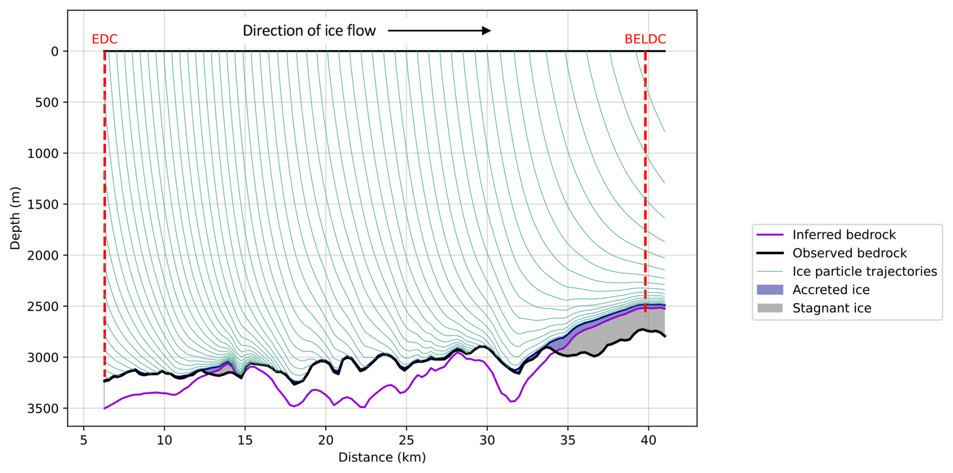 Where the mechanical ice thickness from the model passes below the observed ice thickness, ice flow is still calculated. As a result, some ice originates from particle trajectories that begin beneath the observed bedrock. We have named the layer where this occurs “accreted ice” (blue layer in Fig. 3). An example of this is the layer between the deepest trajectory which does not cross the observed bed and the top of the stagnant ice, over the LDC area beginning at distance >32 km. Over LDC, the thickness of this layer of potentially accreted ice is 120 m at 34 km, decreasing to ∼40 m thickness at the end of the flow line, near BELDC. See Sect. 4.1 for a full discussion of this layer and its implications.
