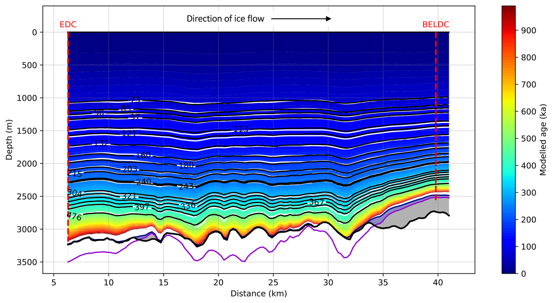 Our 2.5D model finds a different depth–age scale compared to 1D approaches, even in this area of slow horizontal ice flow. These differences arise due to melting and subsequent vertical strain along the flow line leading to BELDC. Such differences have to be taken into account when evaluating the reliability of age–depth relations based on 1D assumptions. Given the available constraints, a full 3D approach might not provide any greater accuracy than the 2.5D approach used here, unless a 3D observational radar dataset for constraining the age–depth relation is used. However, this can only be answered definitively by a comparison of 2.5D and 3D approaches.