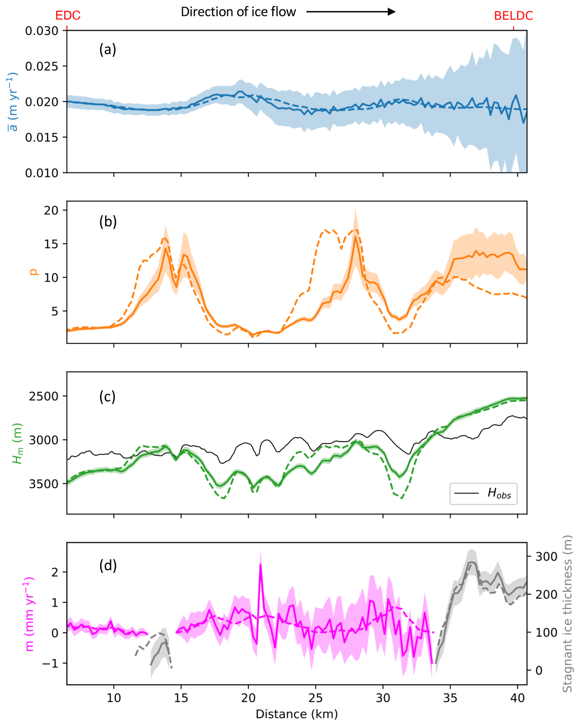 Figure 6 shows the parameters inferred by the 2.5D model in this study compared to the results for the 1D model (Chung et al., 2023b) applied to the same flow line. The steady accumulation rate (Fig. 6) varies similarly for the 2.5D and 1D models in the upstream region. However, there are large variations and uncertainties downstream for the 2.5D model. This is due to the fact that at a given point affects the ice further downstream where there are no isochrone constraints and therefore residuals are unconstrained. The Lliboutry parameter p has a strong peak at 28 km for the 2.5D model where there is a dip in the bedrock, whereas the 1D model has a rounded peak as the averaging of the horizontal flow is taken into account. The Lliboutry parameter p and the mechanical ice thickness Hm show a downstream offset of around 1–2 km relative the 1D model. The melt rate follows the same trend as the 1D model; however, the variations are greater for the 2.5D model, again because the 1D inversion averages the inferred parameters along the horizontal travel of the ice. At EDC, the predicted melt rate is 0.22 mm yr−1, which agrees with previous studies (Passalacqua et al., 2017; Chung et al., 2023b). There is a small section of stagnant ice at a distance of 13 km (max thickness 63 m) and a large layer of stagnant ice around 200 m thick over the LDC relief with a thin layer of possibly accreted ice (see Sect. 3.2).