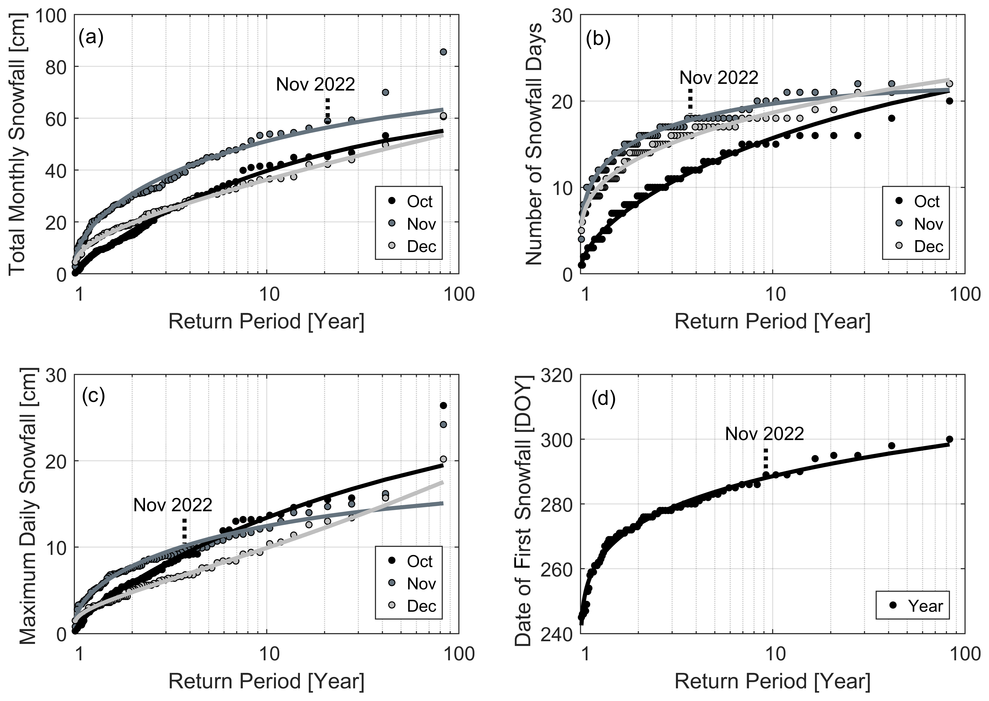 Figure 4Frequency analysis of snowfall parameters: (a) total monthly snowfall, (b) number of snowfall days, (c) maximum daily snowfall magnitude, and (d) timing of the first snowfall of the year. Log-Pearson Type III distributions (lines) are fit to observations (circles). Each circle represents observations in any given year for October, November, and December.