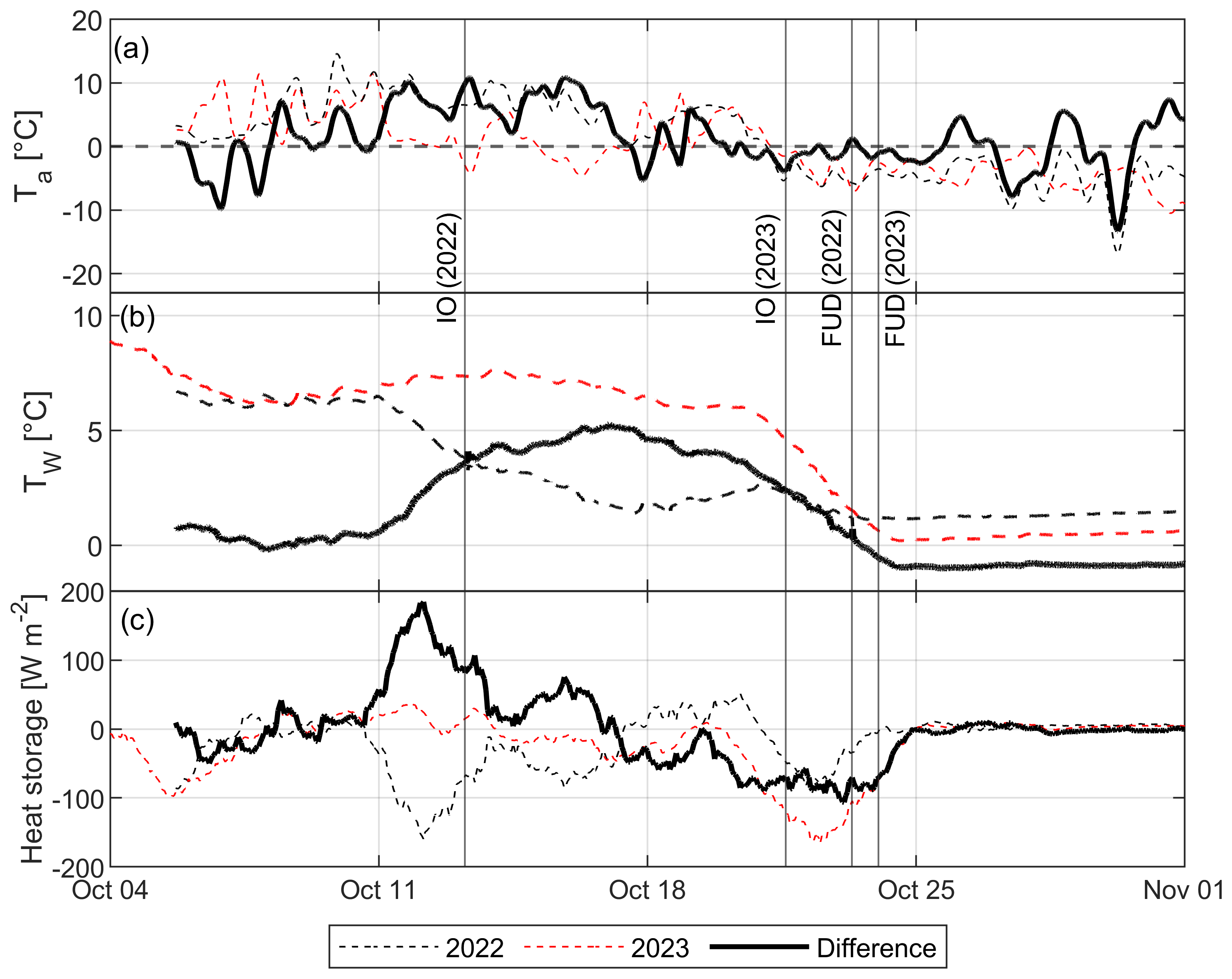 The zero-degree isotherm was crossed on the same date in 2022 and 2023 (21 October), yet IO dates differed by 9 d. Mean daily air temperatures in the first 2 weeks of October 2023 were significantly lower than in 2022 (Fig. 6a). Mean water () and surface temperatures remained similar until 12 October. Between 4 and 11 October, differences in between 2022 and 2023 () were <0.9 °C (Fig. 6b). Changes in heat storage varied between −320.9 and 322.6 W m−2 in 2022 and between −442.4 and 249.0 W m−2 (unsmoothed) in 2023. Between 10 and 18 October, began to diverge significantly as in 2023 remained high (6.00–7.60 °C), slightly warming between 10 and 14 October. in 2022 declined, beginning on 10 October at a mean rate of 1.24 °C d−1 or 0.30 °C per degree decrease in . Warming in 2023 led to a slight net energy gain in the water column (10.4–38.4 W m−2), while rapid losses were observed in and Ts in 2022. Differences in between 2022 and 2023 peaked on 12 October at 184.4 W m−2. A maximum °C between 2022 and 2023 was observed on 16 October (Fig. 6b).