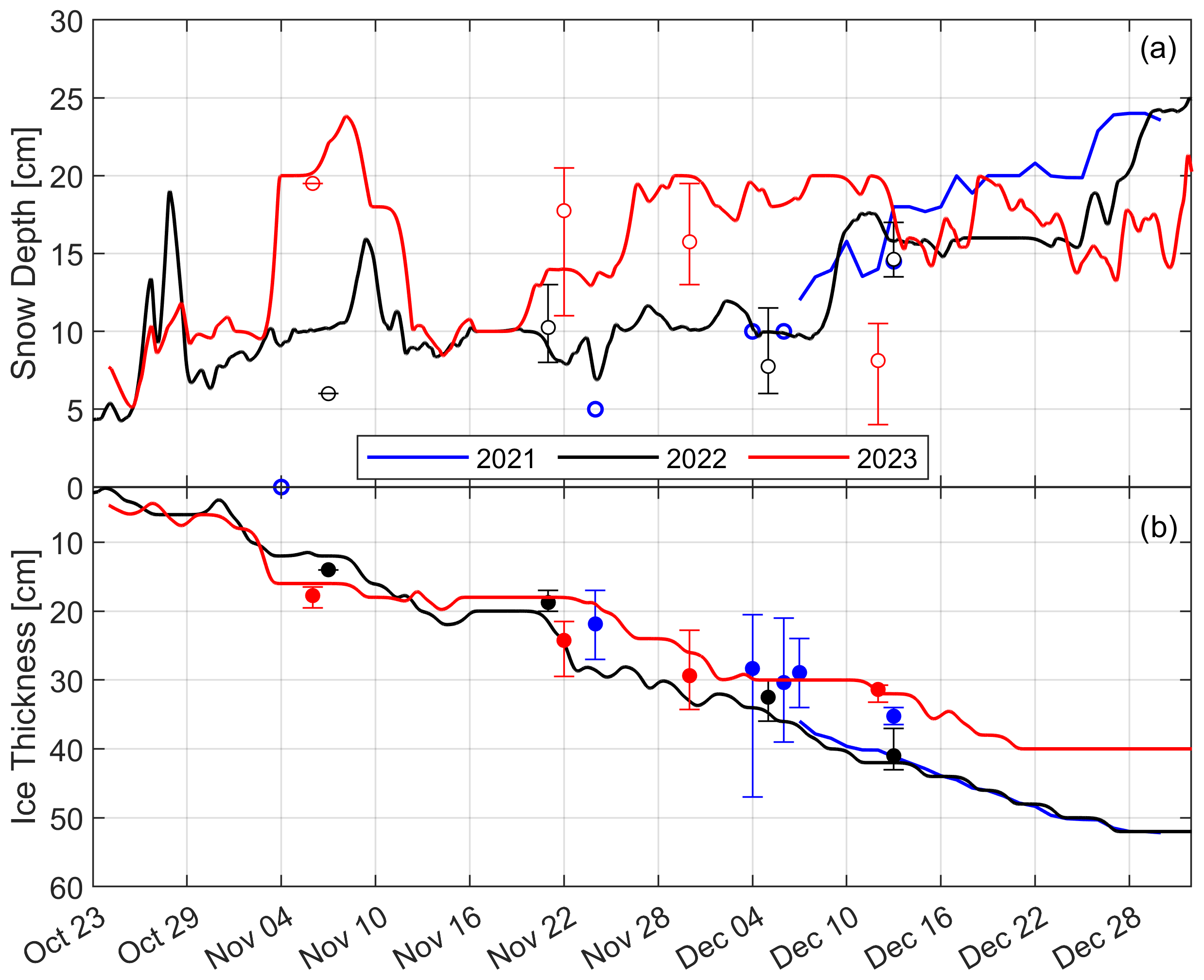 Figure 7SIMBA-derived (a) snow and (b) ice evolution in Landing Lake in 2021, 2022, and 2023 from the freeze-up date to 31 December. Open and closed circles represent the mean value of manual measurements of snow and ice, respectively. Error bars show measured spatial variability around SIMBA. Ice and snow measurements are smoothed over a 3 d sliding window.