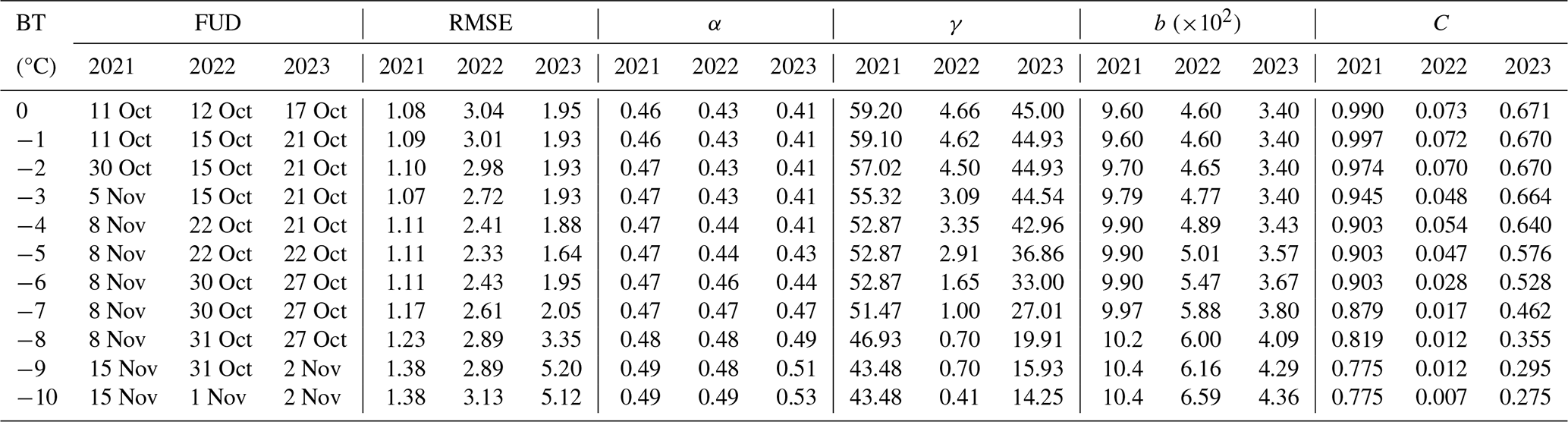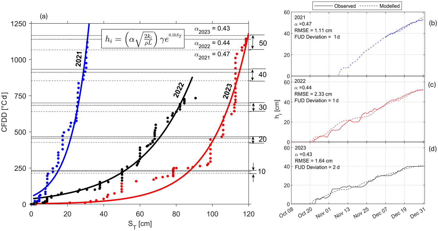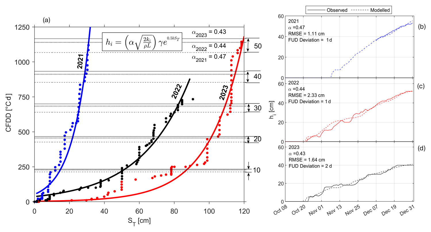 °C was selected as it provided the lowest error (RMSE and deviation) in modelled versus observed hi and FUDs in the range of (Fig. 8). Optimized values of α, γ, b, and C for the years 2021, 2022, and 2023 are summarized in Table 7. The finalized empirical model using is presented in Fig. 9. RMSE between modelled and measured ice thicknesses was small (≤2.33 cm) and deviations in FUDs≤2 d.