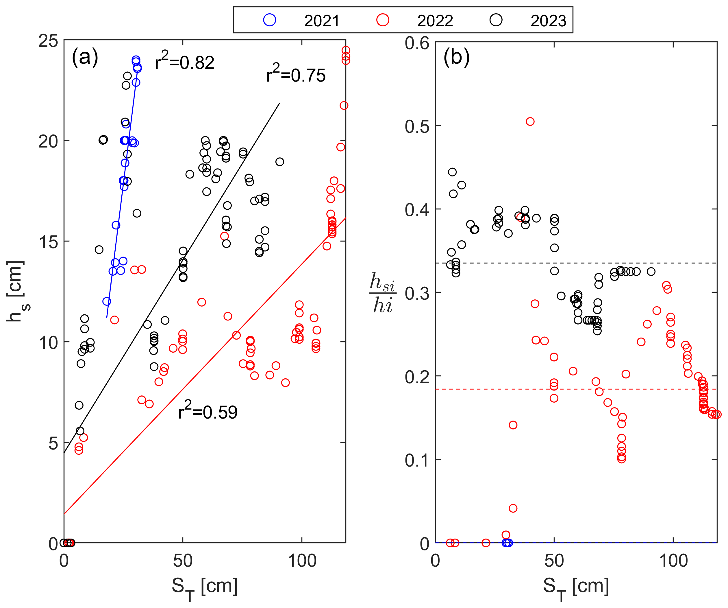 hs was linearly related to ST in all years (Fig. 10). Correlations were strongest in 2021 (r2=0.82) and 2023 (r2=0.75) and the weakest in 2022 (r2=0.59). Both 2022 and 2023 had mean proportions of snow ice to total ice of 18 % (0 %–54 %) and 33 % (0 %–44 %). The correlation between hs and ST was stronger in 2023 than in 2022, despite being greater in 2023. Moderately positive correlations (r2=0.50, 0.67, and 0.76 for 2021, 2022, and 2023, respectively) were also observed between hs and hi.