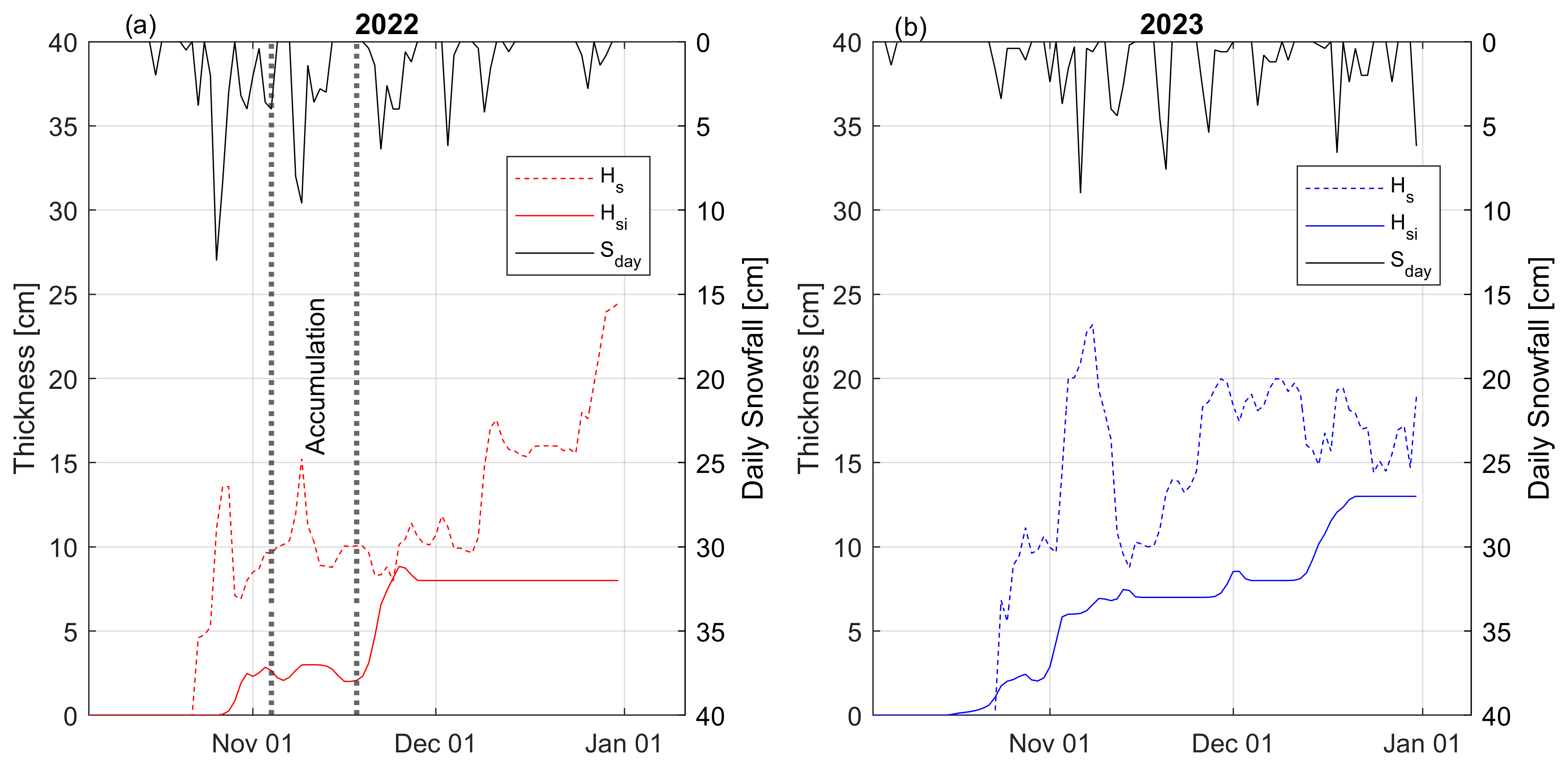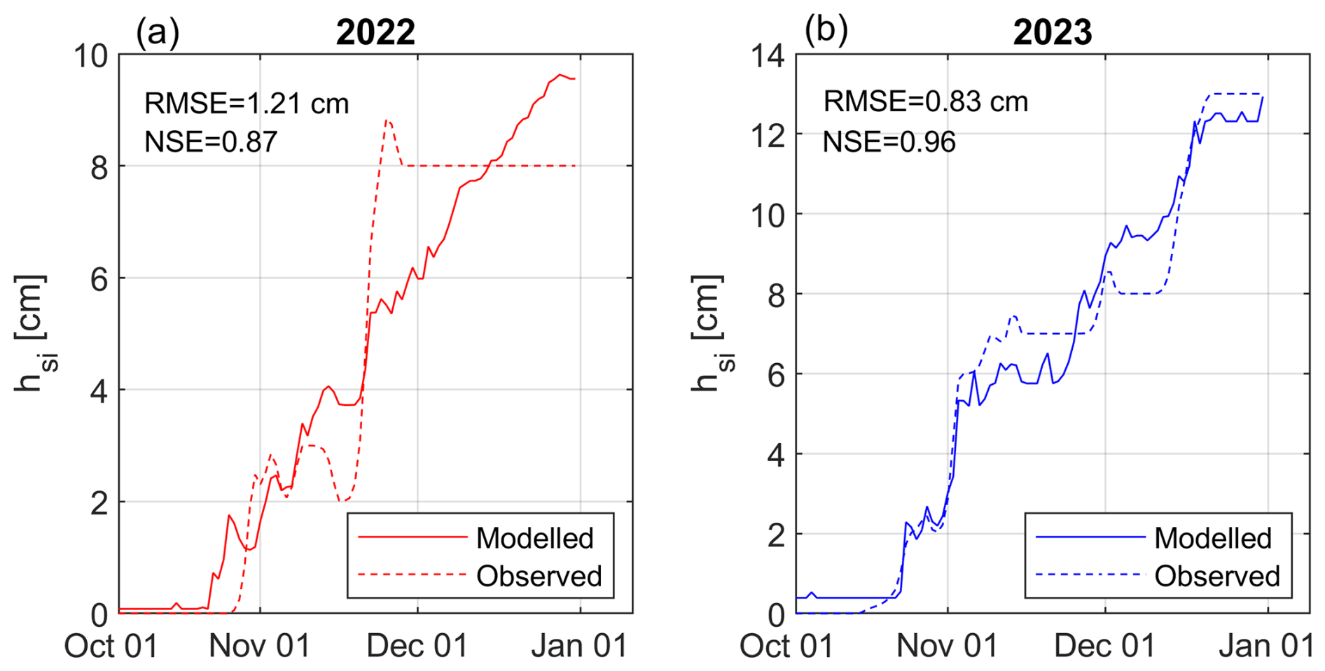 hsi was more accurately simulated in 2023 compared to 2022. In 2023, higher snowfall was closely followed by snow ice formation (Fig. 12b), suggesting near-critical submergence conditions (low freeboard). This contrasts with 2022, where between 4 and 18 November 23.1 cm of snowfall was recorded but no snow ice was produced (Fig. 12a), suggesting that ample freeboard was present in the ice cover to support significant snow loading without submergence. This phenomenon is reflected in Fig. 12a where modelled hsi was not able to accurately capture the rapid snow ice formation between 19 and 25 November when the available freeboard was thought to be exceeded.