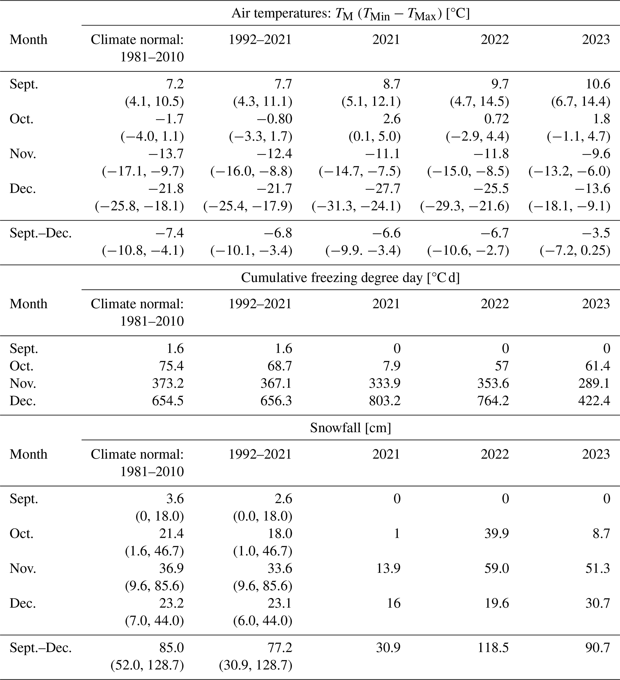 Mean daily air temperatures and cumulative snowfall between September and December 2021, 2022, and 2023 displayed large interannual variability and variability in reference to the climate normal and preceding 30-year periods (Fig. 3, Table 1). TM in September, October, and November 2021–2023 was significantly greater than the 1981–2010 climate normal and 1992–2021 periods (Table 1). Both December 2021 and 2022 were colder than the climate normal and 1981–2010 periods by >3 °C, while December 2023 had anomalously high °C, being ∼8 °C warmer on average than both reference periods. October 2021, 2022, and 2023 TM had above-freezing temperature in contrast to both the climate normal and preceding 30-year record where TM<0 °C (Table 1). The years 2021, 2022, and 2023 also showed notable variability in minimum (TMin) and maximum (TMax) daily air temperatures, particularly in October 2021 where TMin>0 °C and TMax were 3.3 and 3.9 °C greater than the climate normal and the preceding 30-year record, respectively. Despite interannual and long-term variability in TMin and TMax, the range between TMax and TMin remained similar in reference to the climate normal and preceding 30-year periods.