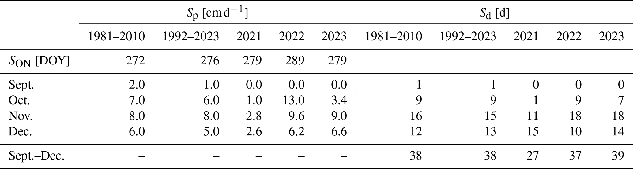 Except for December 2021 and 2022, CFDD in all months between September and December 2021–2023 was lower than normal, indicating warmer-than-normal conditions. October 2021 was particularly warm (and dry), having CFDD=7.9 °C d (Table 1). The same year saw colder-than-normal conditions by the end of December, with CFDD=803.2 °C d (123 % of normal). In 2023, conditions were exceptionally warm, resulting in end-of-December CFDD=422.4 °C d, reaching only 65 % of normal.