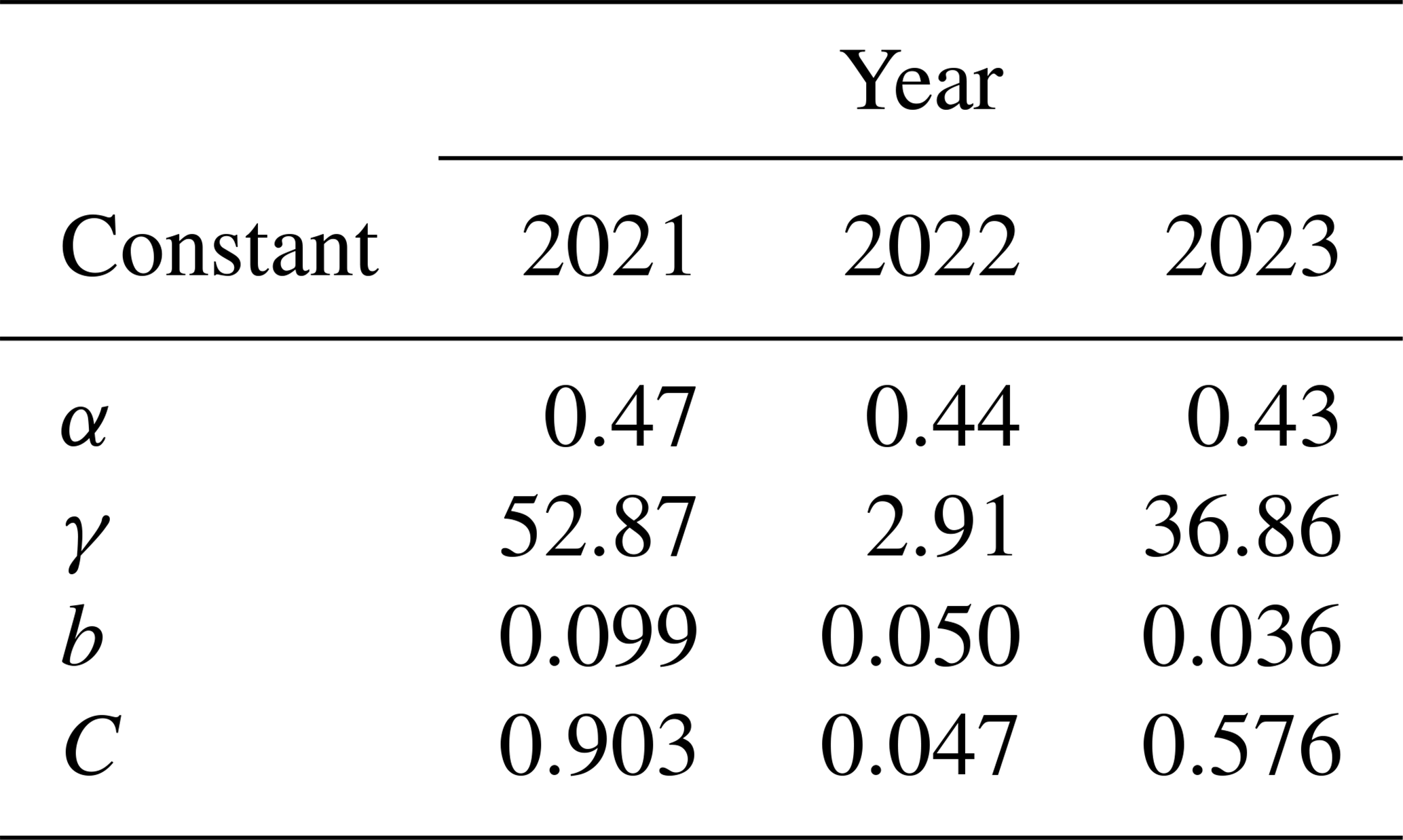 α showed no sensitivity for decreasing CFDD BT from 0 to −5 °C but linearly increased from −5 to −10 °C. The greatest sensitivity was observed in 2023 in the range −5 to −10 °C, with α increasing by an average of 4.9 % °C−1 reduction in BT. Sensitivity in 2021 and 2022 was marginal but slightly greater than in 2022. γ showed a strong decreasing trend with decreasing baseline temperatures across all years. b showed slight increasing trends with decreasing baseline temperatures over the entire range of tested BT. The magnitude of C decreased with decreasing BT across all years (Table 6).