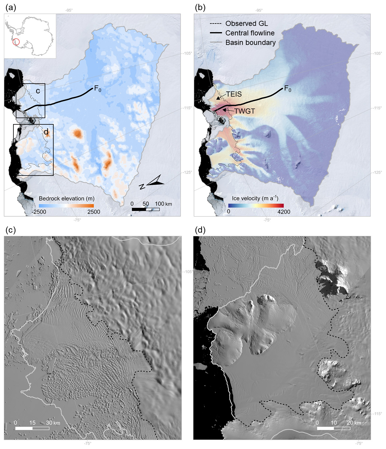 Figure 1Bedrock elevation and ice velocity in the TG basin. (a) Observed bedrock elevation of the TG basin based on BedMachine v2 data (Morlighem et al., 2020) and (b) observed ice velocity of the TG basin based on Making Earth System Data Records for Use in Research Environments (MEaSUREs) InSAR-Based Antarctica Ice Velocity Map, Version 2 (Rignot et al., 2017) overlaid on the Landsat Image Mosaic of Antarctica (LIMA; Bindschadler et al., 2008). The solid black curve is the central flowline profile stemming from the Antarctic surface flowline dataset developed by Liu et al. (2015), which spans 340 km from the inland grounded ice (F0) to the calving front. The dashed black line shows the position of the observed grounding line (Gardner et al., 2018). The inset in panel (a) shows the location of the TG basin in Antarctica. TEIS represents the Thwaites Eastern Ice Shelf and TWGT represents the Thwaites Western Glacier Tongue. The black rectangular insets in panel (a) are panels (c) and (d), which show the crevasse distributions across the ice-shelf regions in the TG basin, based on Landsat-8 satellite images acquired in December 2020. The gray line is the basin boundary of the TG basin derived from Zwally et al. (2015). The black–gray bar in panel (a) and white–gray bars in panels (c) and (d) are scale bars of the corresponding maps.
