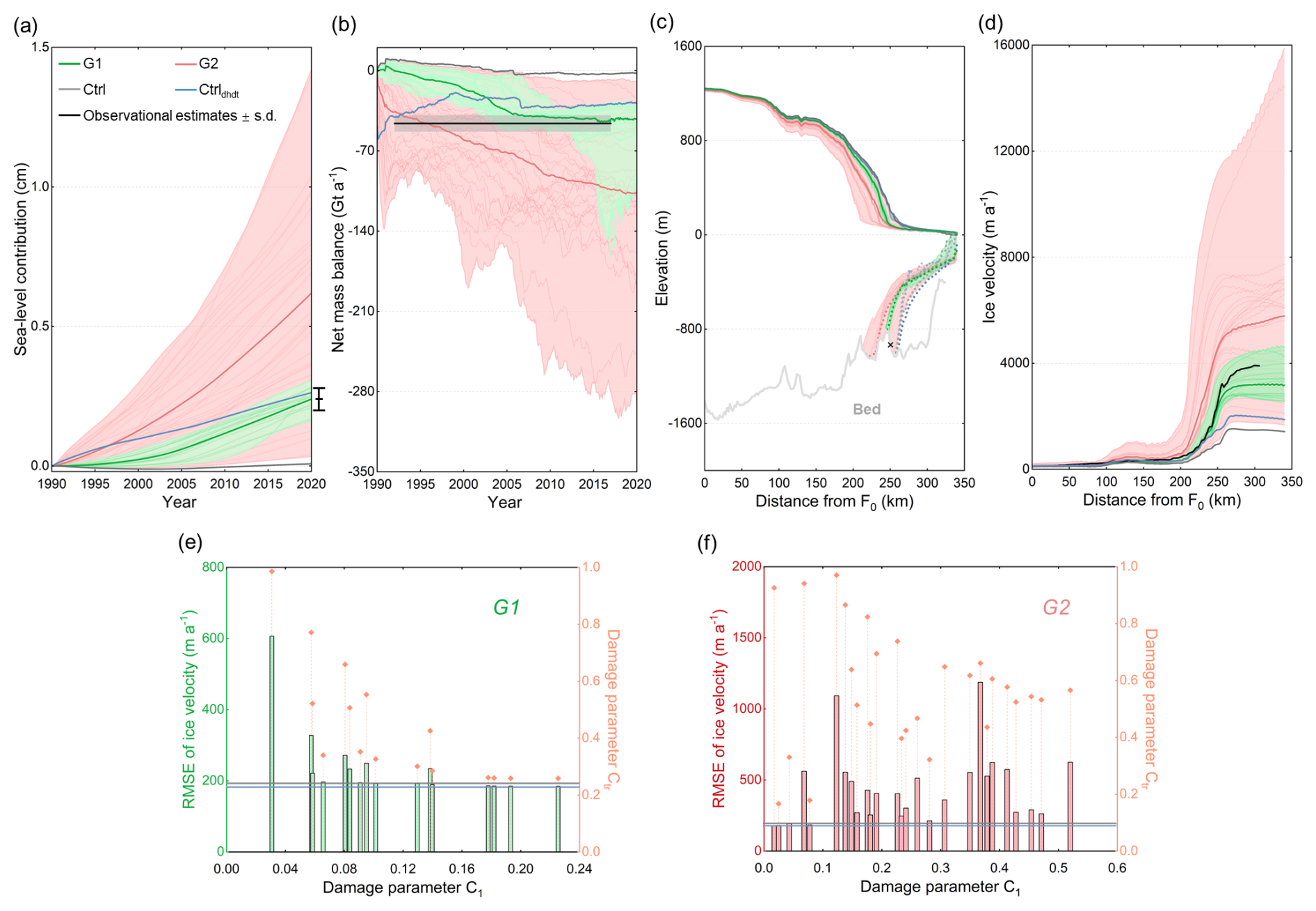 Figure 2Simulated change trends of ice mass balance and grounding-line position in the TG basin under different damage intensities over the period 1990–2020. (a) The simulated contribution of ice mass loss in the TG basin to sea level; (b) the net mass balance (considering volume above flotation only, i.e., the rate of mass change contributing to sea-level rise) in the TG basin; (c) the geometry profiles along the central flowline profile (solid black line in Fig. 1) and the simulated (dashed red and green lines) grounding-line positions; and (d) the simulated ice velocity along the central flowline profile. RMSEs between the simulated and observed ice velocity under different parameter combinations of C1 and Ctr in (e) Group 1 and (f) Group 2. The dark-red and green lines in panels (a)–(d) represent the mean, and the hatched area represents the ensemble range, i.e., spread between maximum/minimum values. The vertical black lines on the right side of panel (a) represent the observed mean value ±1 standard deviation (Shepherd et al., 2019). The black line and shaded area in panel (b) represent the observed mean value ±1 standard deviation (Shepherd et al., 2019). The gray line represents the simulation result of the model that ignored ice damage processes and did not integrate satellite-based observations of present-day mass-change rates to constrain the model initialization (Ctrl experiment), and the blue line represents the simulation result of the model that ignored ice damage processes but integrated satellite-based observations to constrain the model initialization (Ctrldhdt experiment). In panel (c), the dashed light-gray and blue lines represent the initial grounding-line positions for the Ctrl/damage experiments and the Ctrldhdt experiment, and the black cross marks the location of the observed grounding-line position (Gardner et al., 2018).