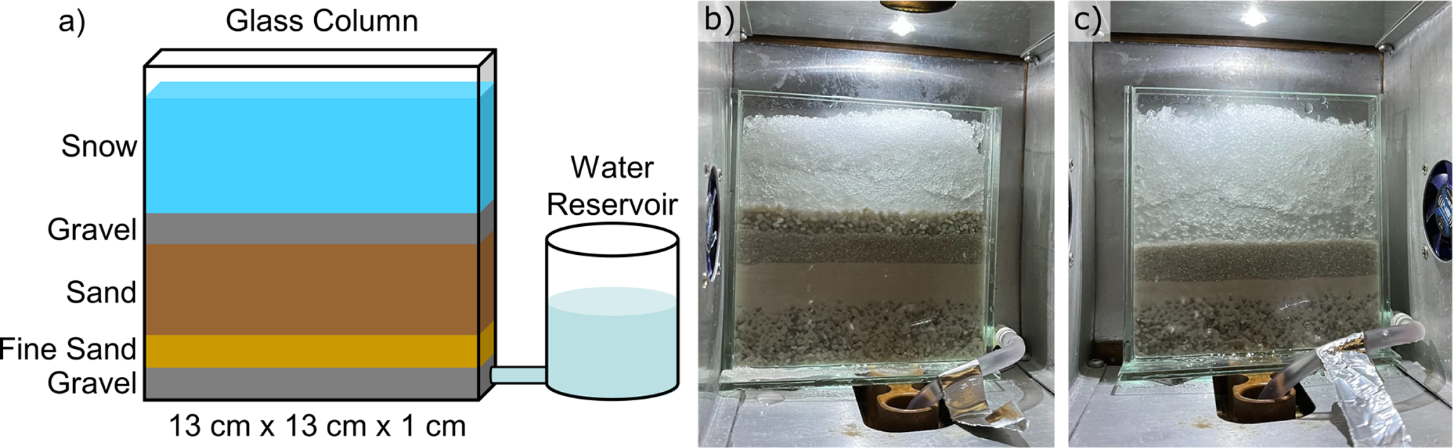 The samples placed into the beam were prepared in glass columns with face dimensions (perpendicular to the beam) of 13 cm × 13 cm with a sample thickness in the beam direction of 1 cm with 3 mm thick walls (Fig. 1a). Each column consisted of a layering of sands (Carlo Bernasconi AG (Bern, Switzerland)) and snow. Sand (0.3–0.9 mm diameter) and gravel (2.0–3.2 mm diameter) were used as soil and vegetation analogs, respectively. These materials were used to mimic the capillary forces of the soil-vegetation-snow layering found in nature under many gliding snowpacks (Feistl et al., 2014). The gravel was used to mimic the weak capillary forces of a high porosity vegetation layer. Fine sand (0.06–0.25 mm diameter) and gravel were used at the bottom of each column to form a barrier for air infiltration from above after initial wetting, and allow for homogeneous and fast capillary rise into the soil analog layer. The sands and gravel were dry when packing the column. Each column was connected to a water reservoir filled with water at 0 °C with which the height of the water table, and thereby the pressure, was controlled.