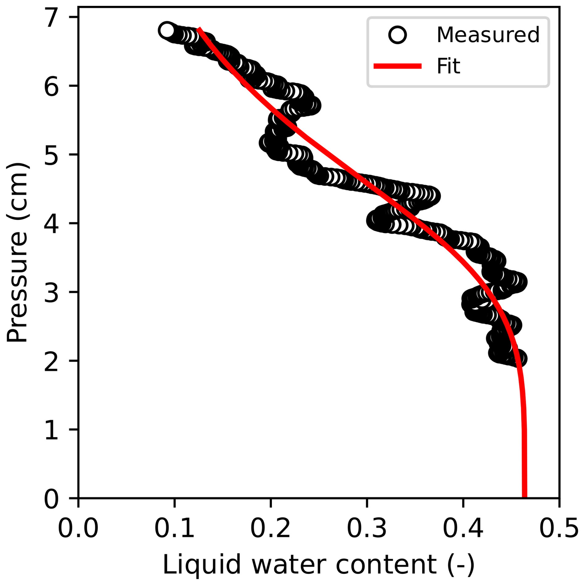 Fitting of the water retention curves was performed on the horizontally averaged liquid water content profiles from the last image of each experiment, which assumes that the water distribution is close to hydrostatic equilibrium. An example fit of FGs,g is provided in Fig. 4 with the remaining fits in the Appendix (Figs. A5, A6, A7). The pressures were calculated based on the height above the water level in the reservoir. The fit was performed using a nonlinear least squares approach with Eq. (10). All parameters were allowed to vary freely except θr, which was limited to a value close to zero (maximum 0.001). Typically, a value of around 0.02 is used for the residual water content of snow (Yamaguchi et al., 2012; Wever et al., 2014). However, since the initial wetting curve of a truly dry sample cannot start at a value greater than 0, a value of 0 was more appropriate for these experiments. The relationship was used (van Genuchten, 1980), where n must be larger than 1.