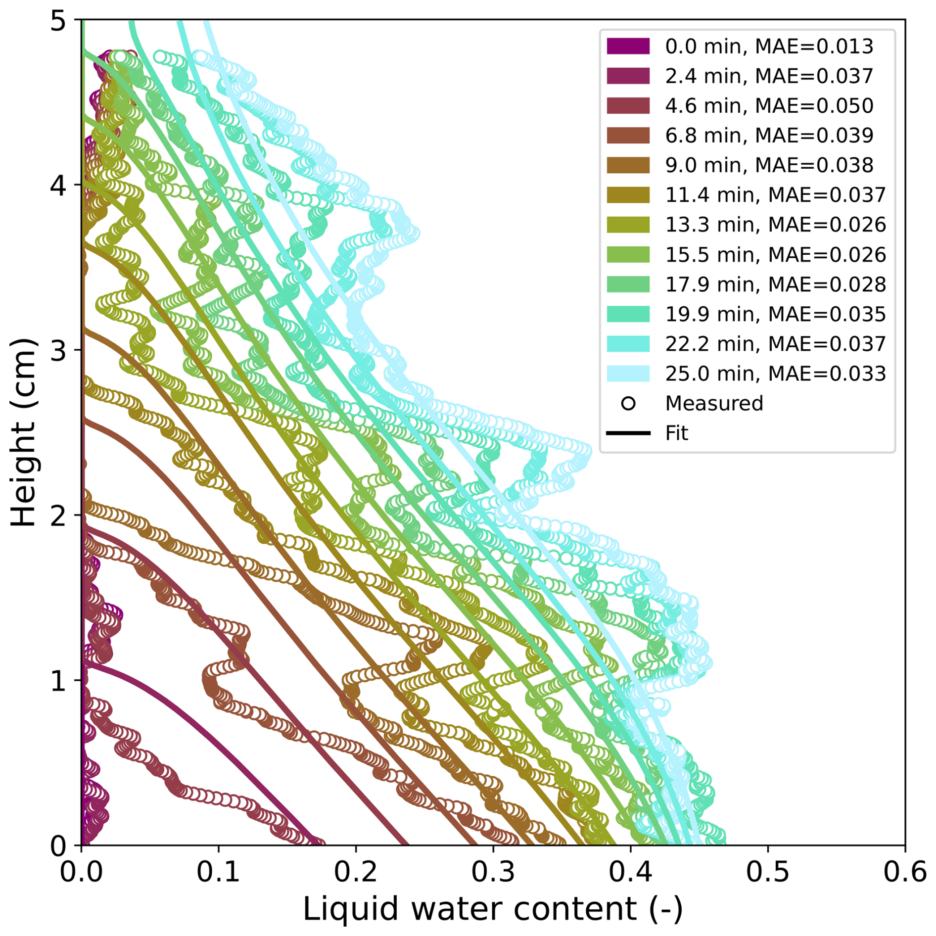 where nm is the number of measurements, ymeasured are the measured values, and yfit are the fit values. The measured values were the horizontally averaged liquid water content values measured by neutron radiography and the fit values were from the least squares regression. The units of the MAE are liquid water content expressed as volume fraction.