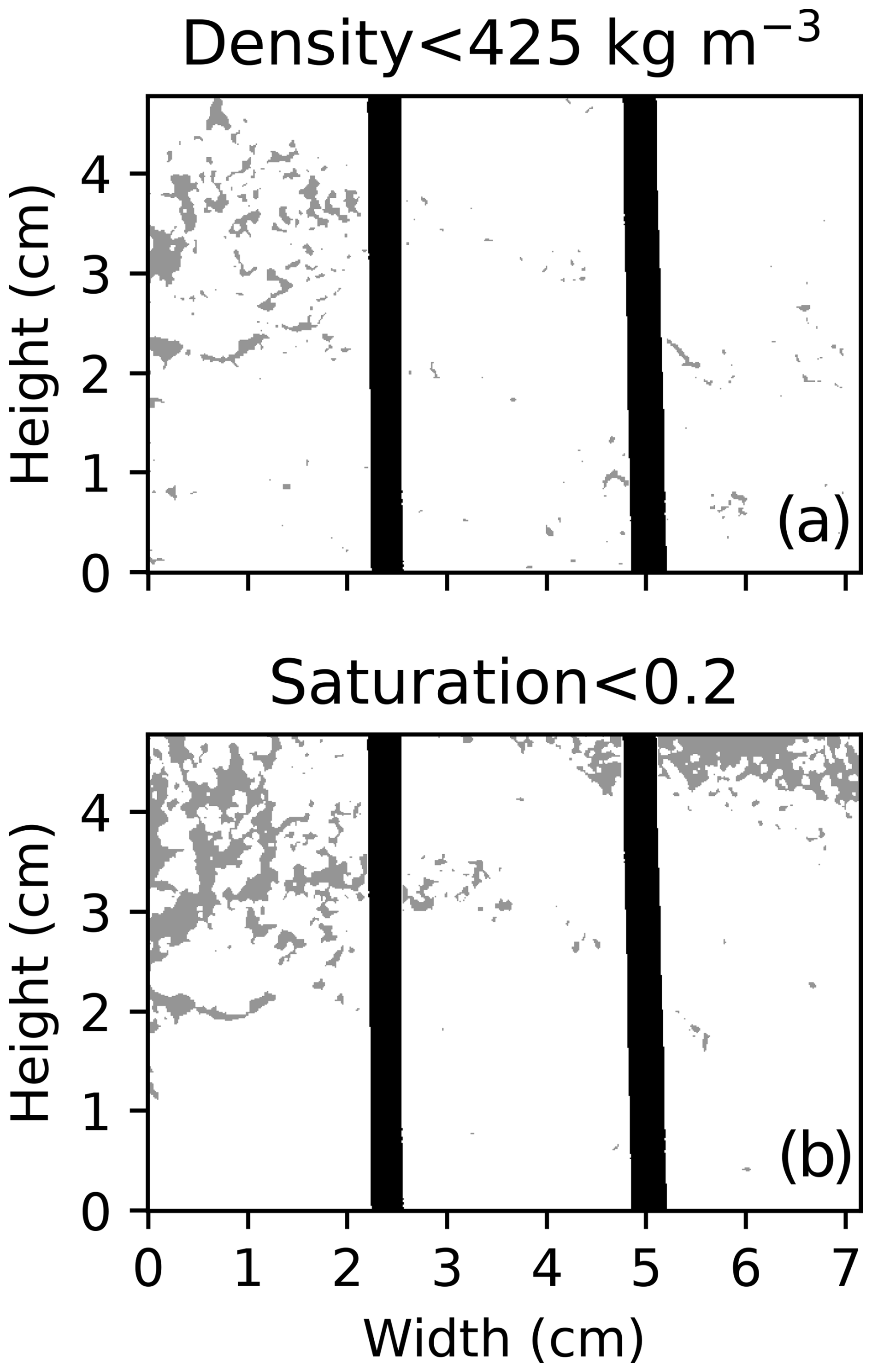 Figure 10Segmented images of FGs,g showing regions with dry densities less than 425 kg m−3 in gray (a) and regions with final saturation values less than 20 % in gray (b). The black bodies are shown in black. The region of low saturation in the upper right of the saturation plot is an artifact of high initial density due to surface melting, which caused a high initial density and therefore a small increase in saturation.