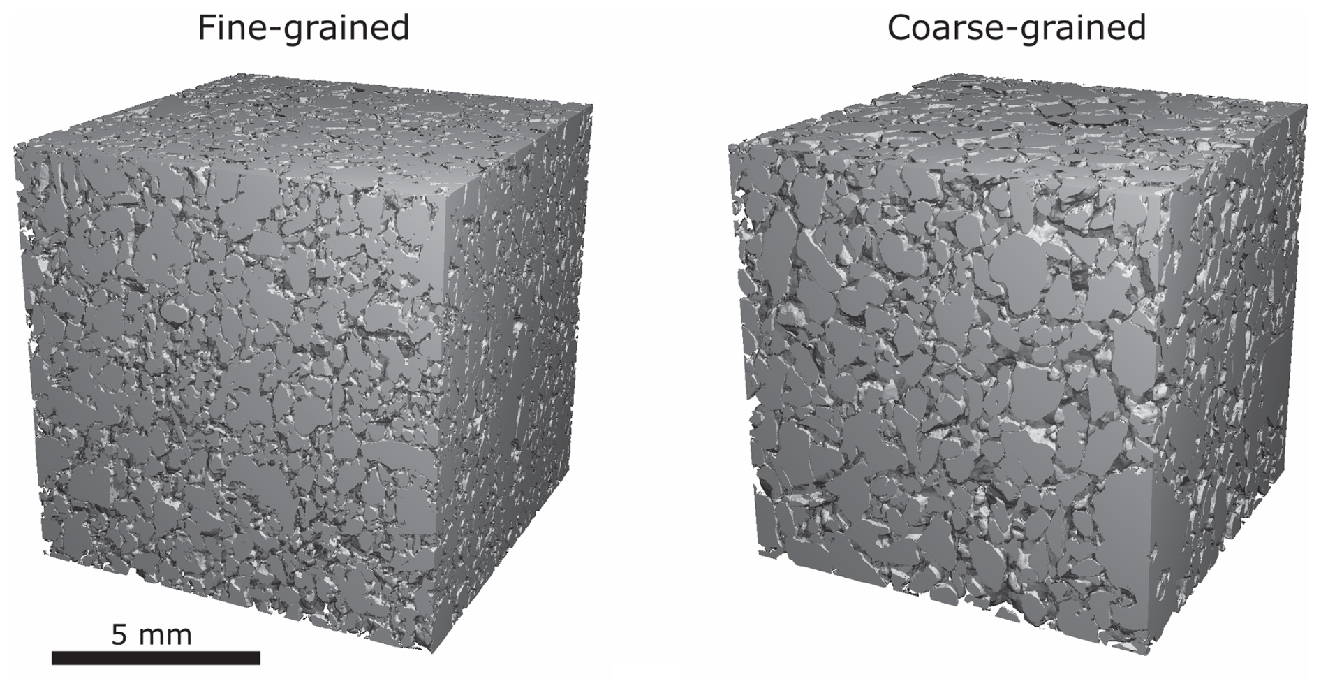 Two snow types were used. The fine-grained (FG) snow was a natural snow sample of melt forms and small rounded grains with a grain size of 0.25–0.75 mm (Fierz et al., 2009). The coarse-grained (CG) snow was an artificial snow sample grown using the Snowmaker (Schleef et al., 2014) and stored at 0 °C with periods at +2 °C in the laboratory to generate melt forms with grain size 0.5–1.5 mm (Fierz et al., 2009). The fine-grained snow had a density of 531 kg m−3 and coarse-grained snow had a density of 547 kg m−3 as determined from micro-computed tomography (μCT) scans (Fig. A1). The densities were expected to vary from the laboratory values after packing into the column at PSI. Specific surface area (SSA, surface area per mass snow) was also determined from the μCT scans and was used to calculate the optically equivalent grain size needed for the parameterization described by Calonne et al. (2012). The optically equivalent grain diameter was determined using the relationship (Calonne et al., 2012). Micro-computed tomography was performed on a μCT 90 by SCANCO Medical AG (Brüttisellen, Switzerland) with a voxel size of 11 µm, and X-ray tube settings of 55 kVp and 8 W. The segmentation was performed using the method described by Hagenmuller et al. (2013).