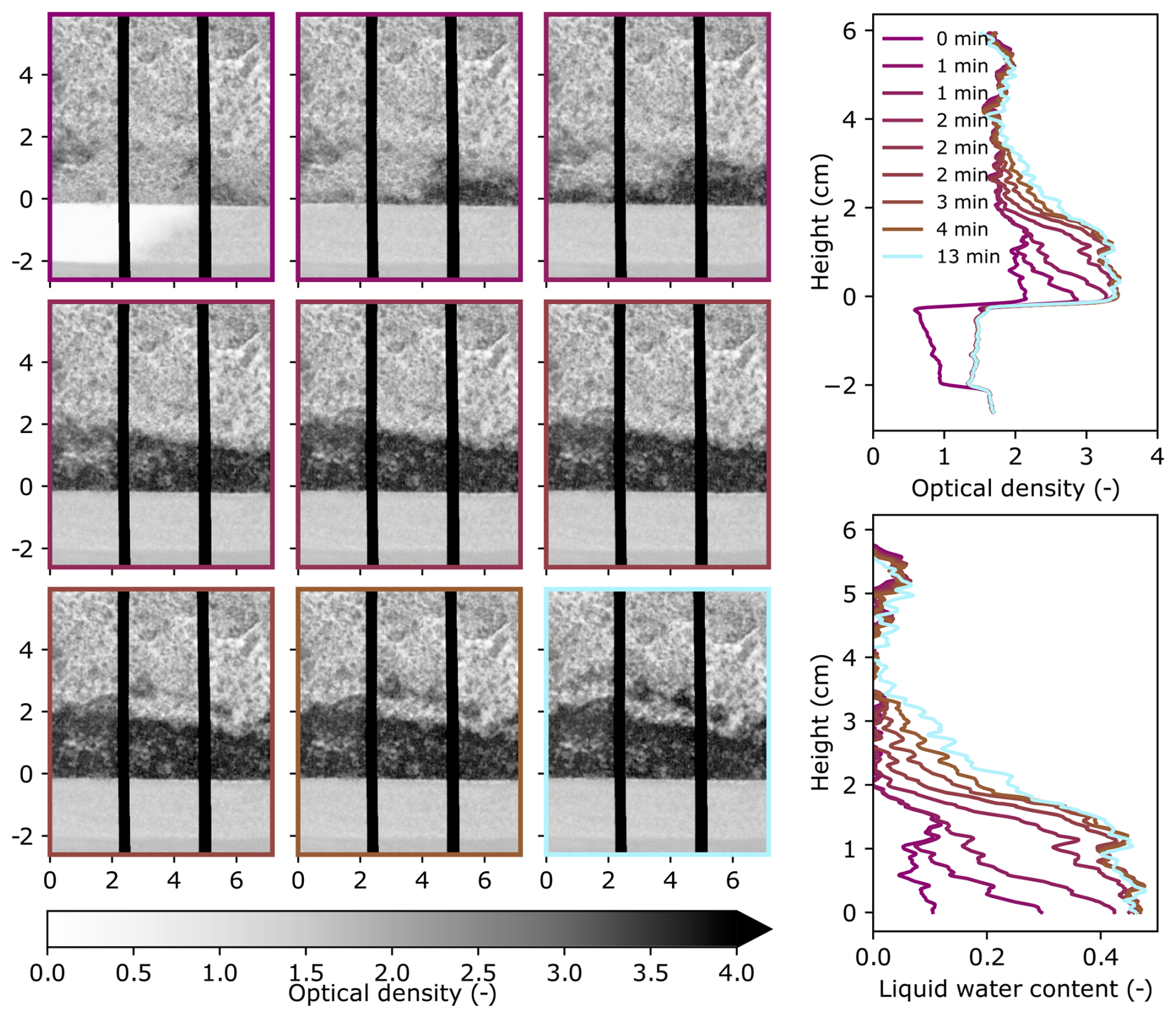 For the pixel method used for the wetting front analyses, 2D variations in density were accounted for. However, the influence of water in the initial images was not. Thus, uncertainties in the wetting front position are likely for regions with high liquid water contents in the initial images as these dry densities were artificially high.