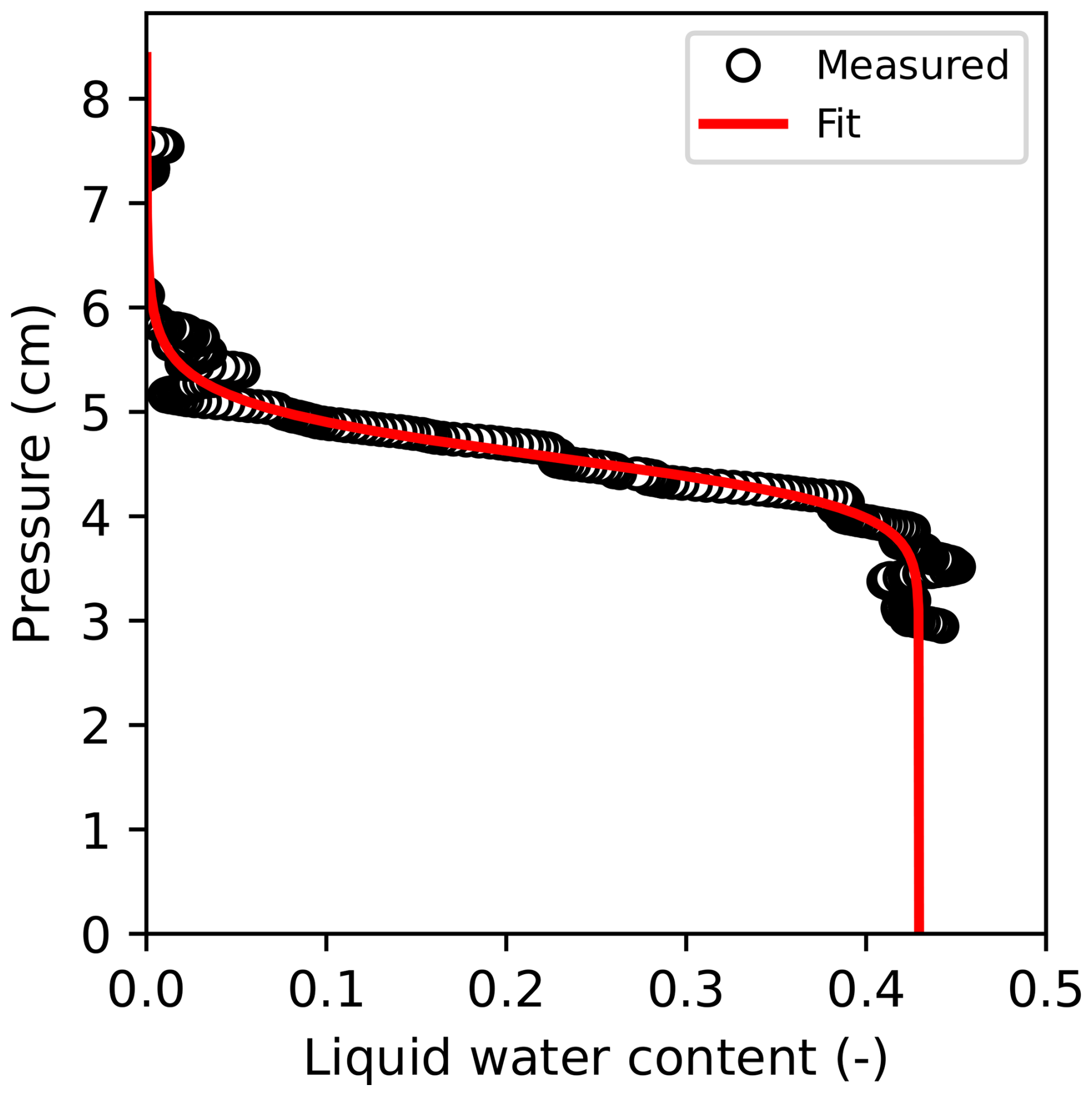 Figure A5The 1D liquid water content of FGs as a function of pressure head (black circles) and the fit of these points to Eq. (10) (red line) with the mean absolute error (MAE) equal to 0.041 and expressed as the volume fraction of liquid water content.