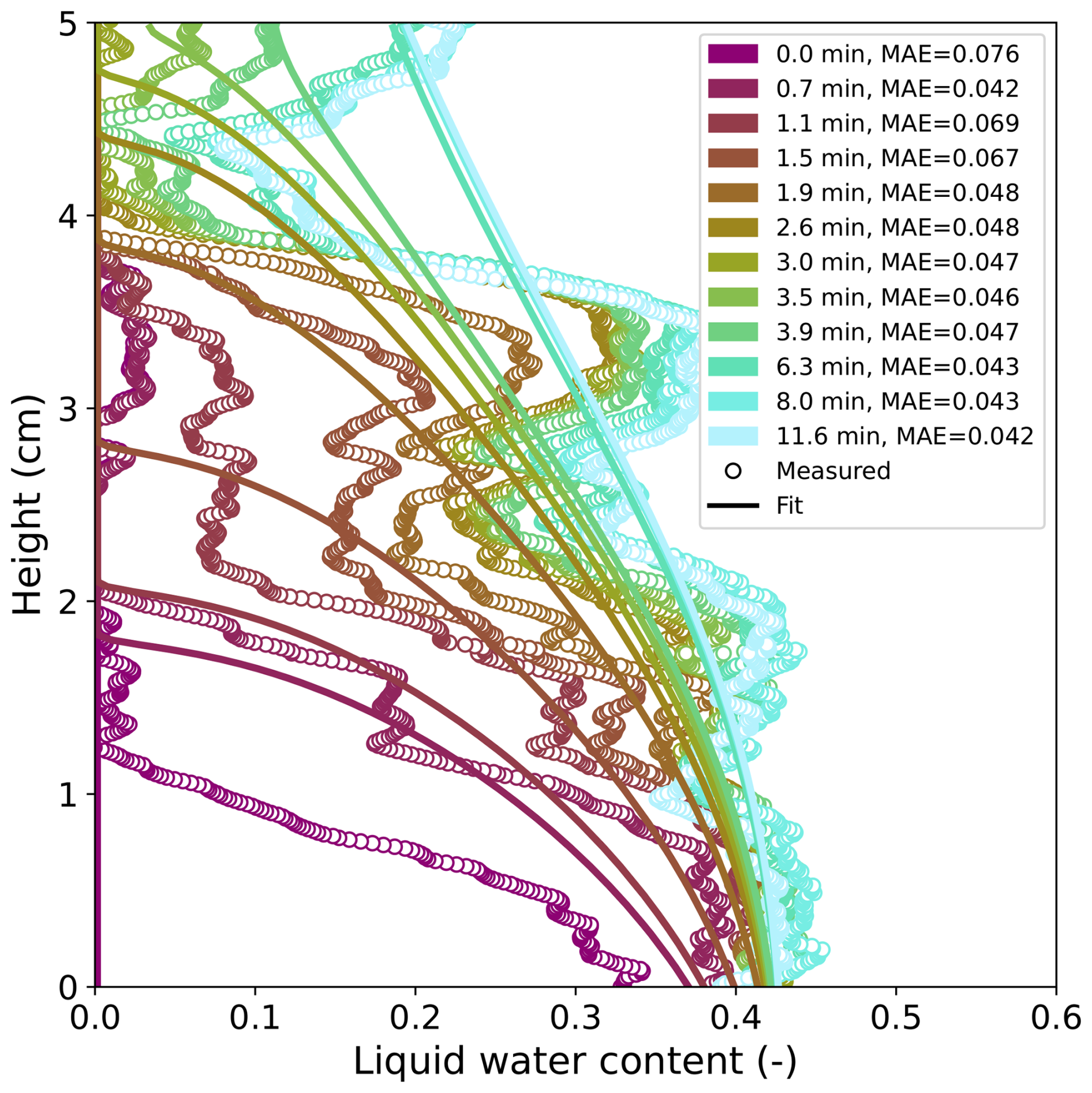 The results of the fitting of the water retention curve (Figs. 4, A5–A7) and inverse fitting of temporal dynamics (Figs. 5, A8–A10) are provided in Table 1 with comparison to literature values using standard methods for determining these parameters. The MAE for the static fits ranged from 0.019–0.041 liquid water content (Figs. 4, A5–A7). The MAE for the inverse fits ranged from 0.013–0.076 liquid water content and was calculated for each timestep (Figs. 5, A8–A10).