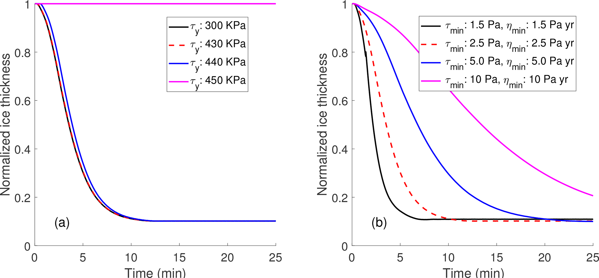 Figure 6The sensitivity of mean ice thickness changes of Sedongpu to different initial yield stress values (a), model parameters τmin and ηmin (b) during the 25 min model time span. The detachment begins at minute 5. The y-axis indicates the normalized value of mean ice thickness (Ht/Ht0) along the flowline.