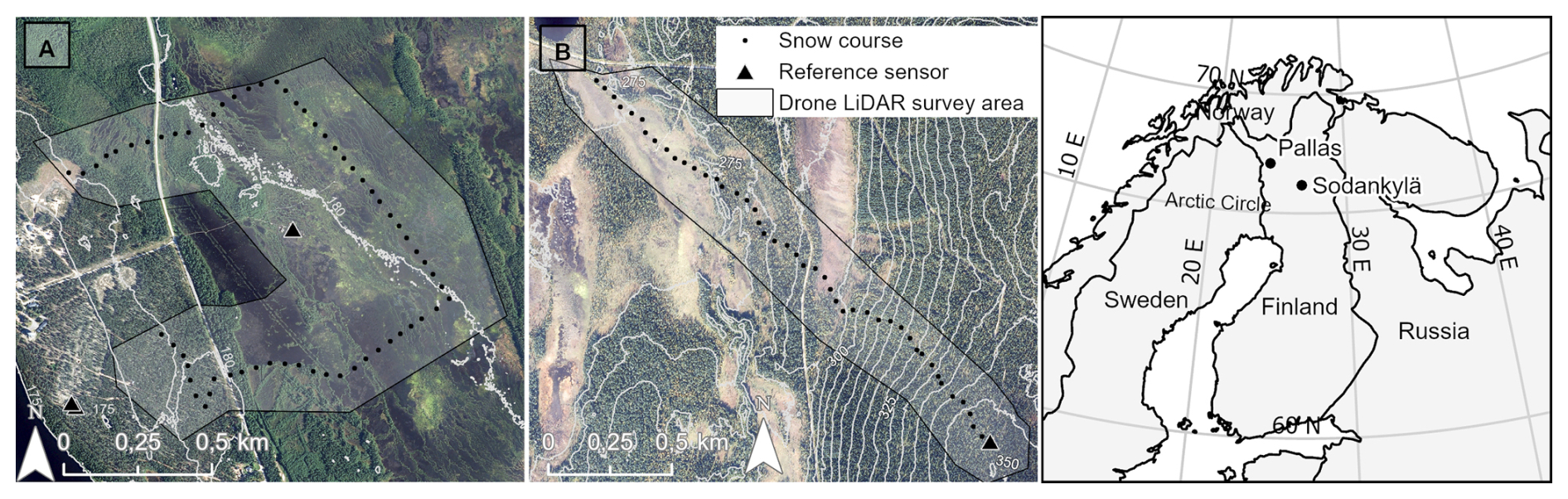 Two study areas were chosen to present different environmental conditions for Finnish Lapland and sub-arctic and boreal zones, namely Pallas (Fig. 1a) and Sodankylä (Fig. 1b). Both sites have ongoing snow course measurements operated by the Finnish Environment Institute (SYKE) and at least one ultrasonic snow depth sensor together with a weather station operated by the Finnish Meteorological institute (FMI). Data collected by SYKE and FMI are publicly available (Sect. 2.2.4).