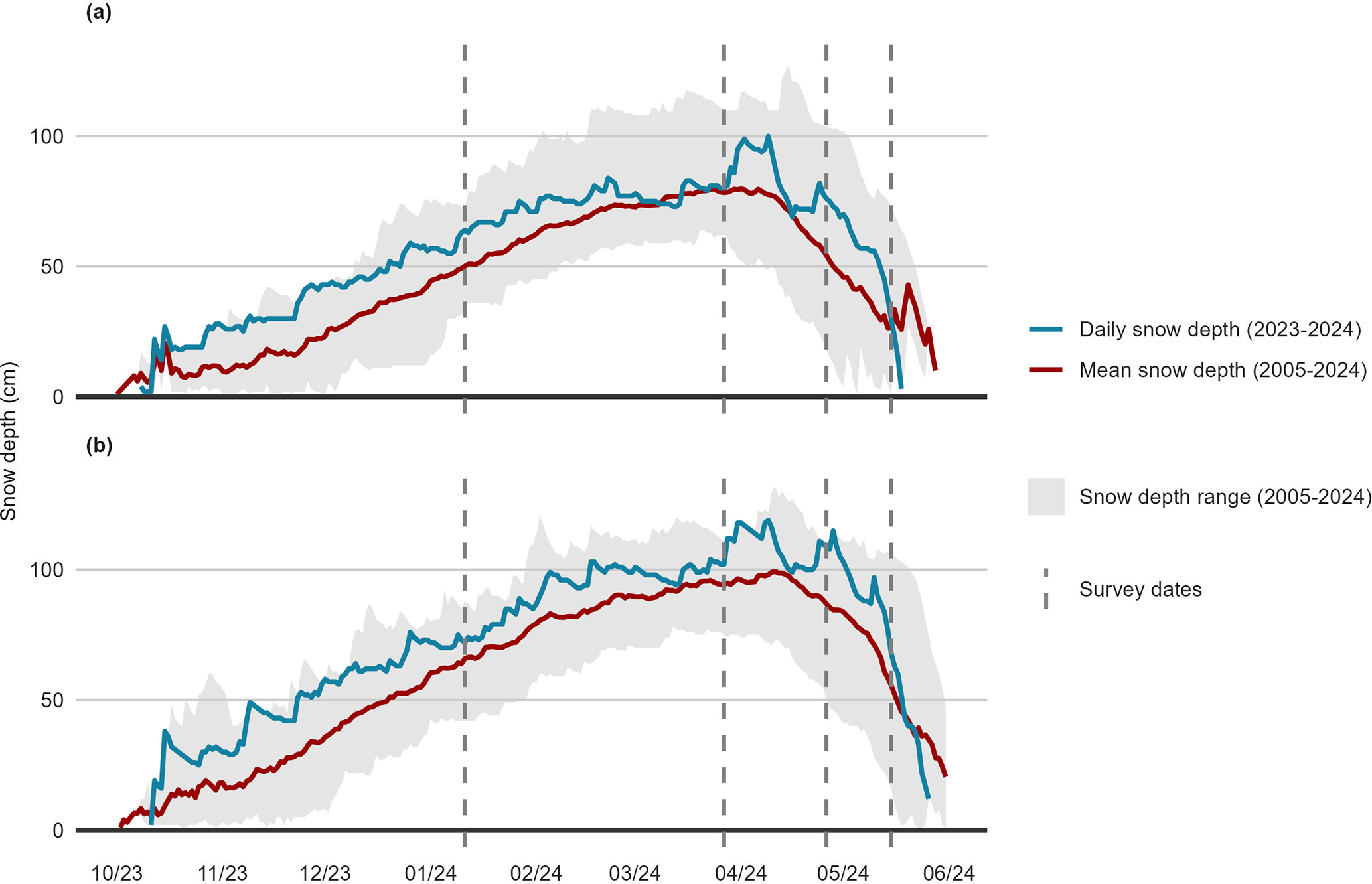 Figure 2Snow depths from each site's FMI stations. Sodankylä (a), and Pallas (b). Dark dashed lines represent the UAV campaign dates from the winter of 2023–2024. The red line represents the long-term average snow depth (2005–2024), and blue lines the daily snow depths of this study's winter season 2023–2024.