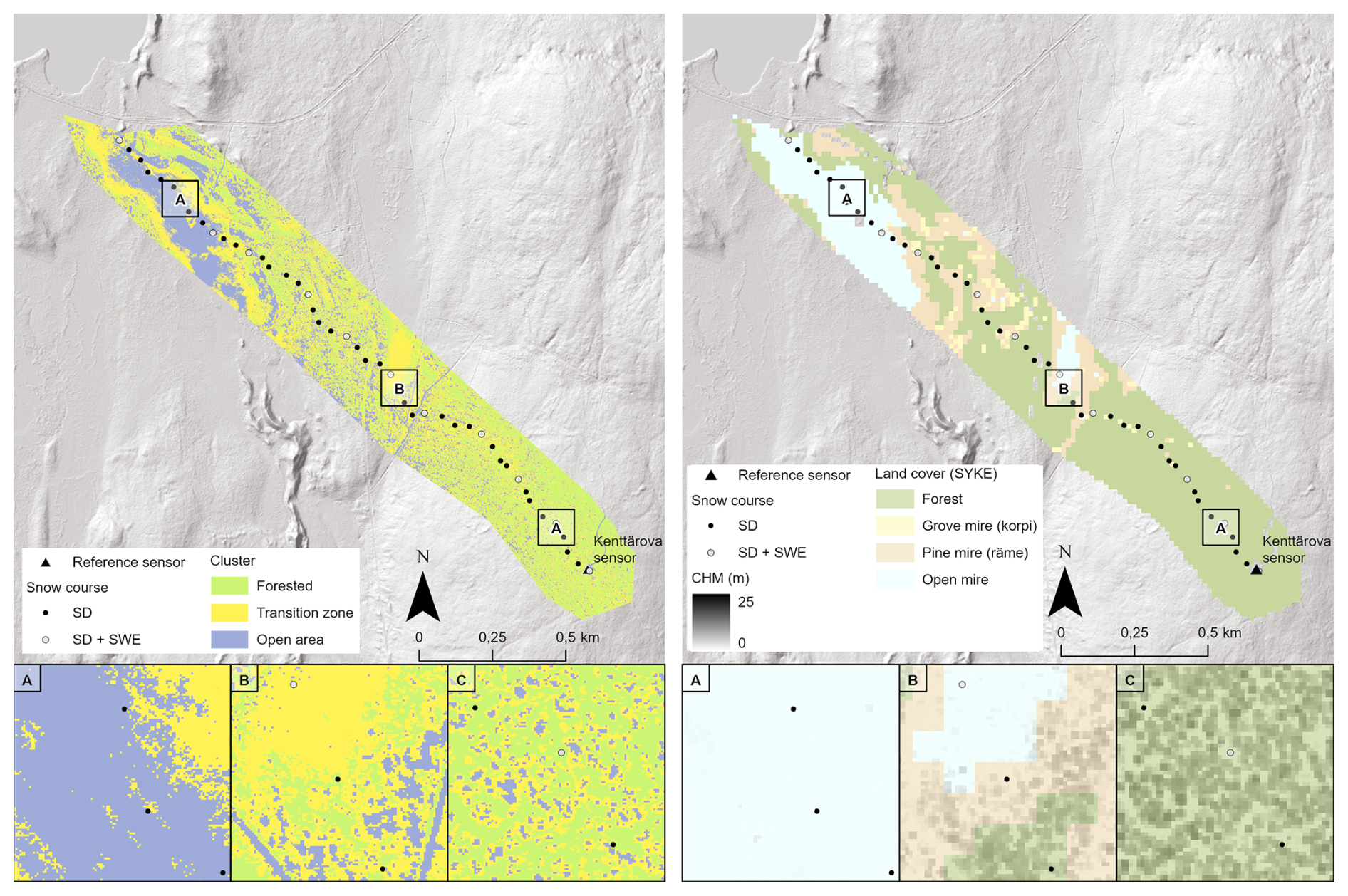 Source: Finnish Meteorological Institute (FMI) (2025), Open data: Snow depth, average temperature, precipitation amount, https://en.ilmatieteenlaitos.fi/download-observations, last access: 3 March 2025. Source: Syke (2018), Open data: Corine Land cover 2018 20m, https://www.syke.fi/en/environmental-data/downloadable-spatial-datasets#corine-land-cover, last access: 3 June 2024, National Land Survey of Finland (NLS) (2020).