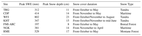 Table 2Summary of snow characteristics at the selected study sites. Snow classification by Sturm and Liston (2021).