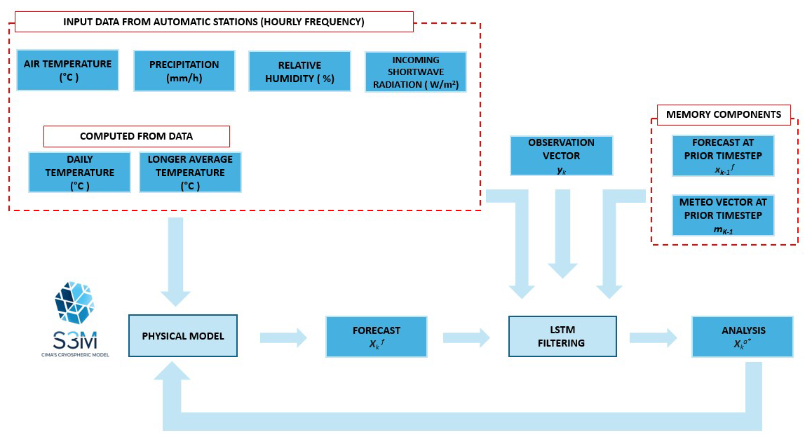 For this pilot application of a new deep data assimilation scheme, a point-scale version of S3M has been employed. This version retains all the features of the original S3M model, such as precipitation-phase partitioning, snow mass balance, snow metamorphism, and hydraulics, but it models snow dynamics at one point rather than in grid cells distributed across the landscape.