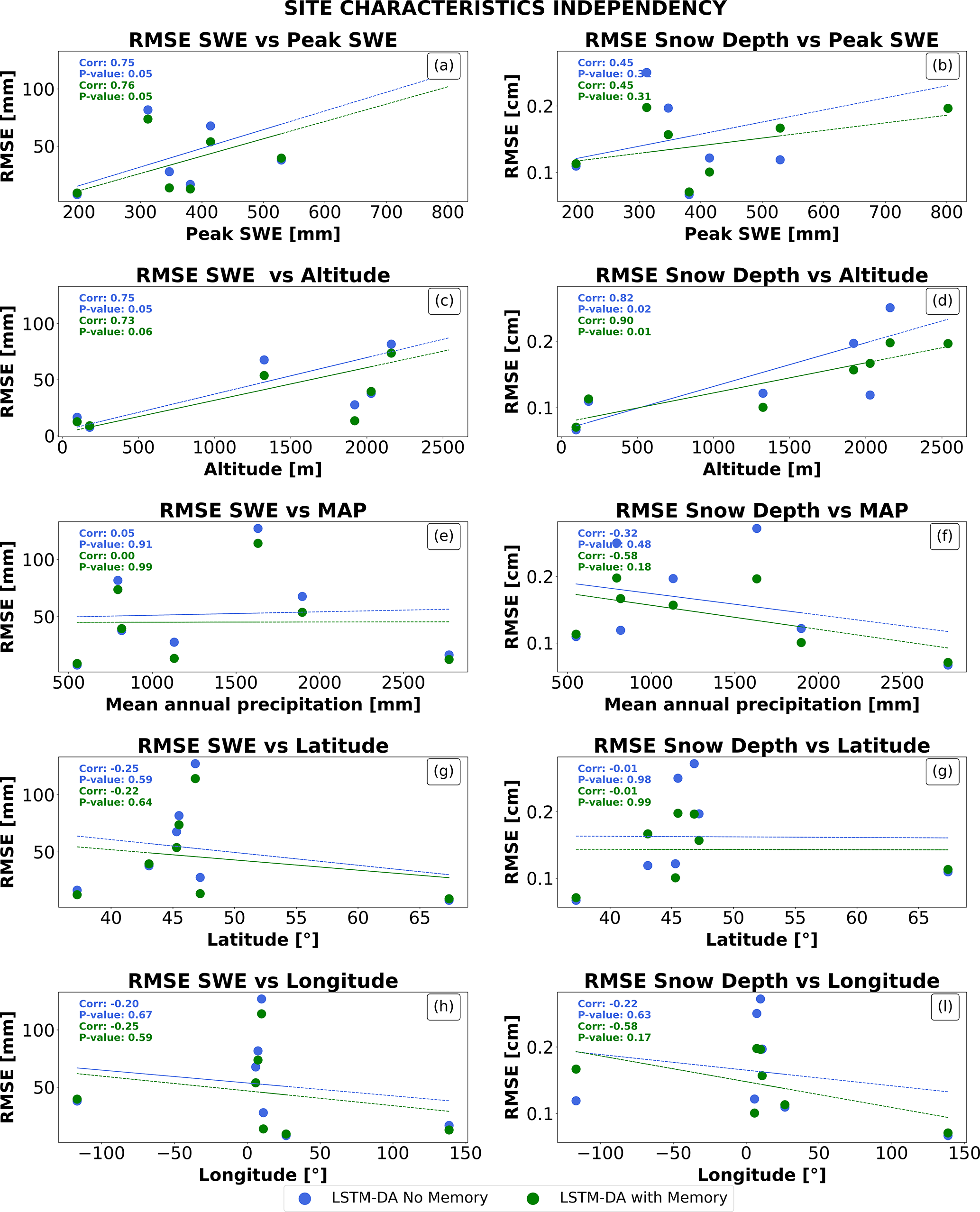 Recently, Deep Learning (DL) has gained attention for its ability to model complex system dynamics without requiring detailed knowledge of physical processes or relying on strict structural assumptions (Sit et al., 2020). Based on interconnected neural networks, these model architectures excel at learning system dynamics from large datasets, and may overcome the structural limitations that challenge traditional physically-based models (LeCun et al., 2015; Murphy, 2023). Among the most commonly used Deep Learning architectures, Long Short-Term Memory (LSTM) networks (Hochreiter and Schmidhuber, 1997), a type of recurrent neural networks, can memorize internal system states and capture long-term dependencies between inputs and outputs. LSTM networks have demonstrated significant success in predicting time-series data, particularly in hydrological applications, where they have shown comparable performance to traditional physically-based models (Fan et al., 2020; Chen et al., 2023; Kratzert et al., 2018, 2019). Due to the strong temporal autocorrelation and memory of the snowpack (Fiddes et al., 2019), these networks appear to be especially well suited for snow analysis.