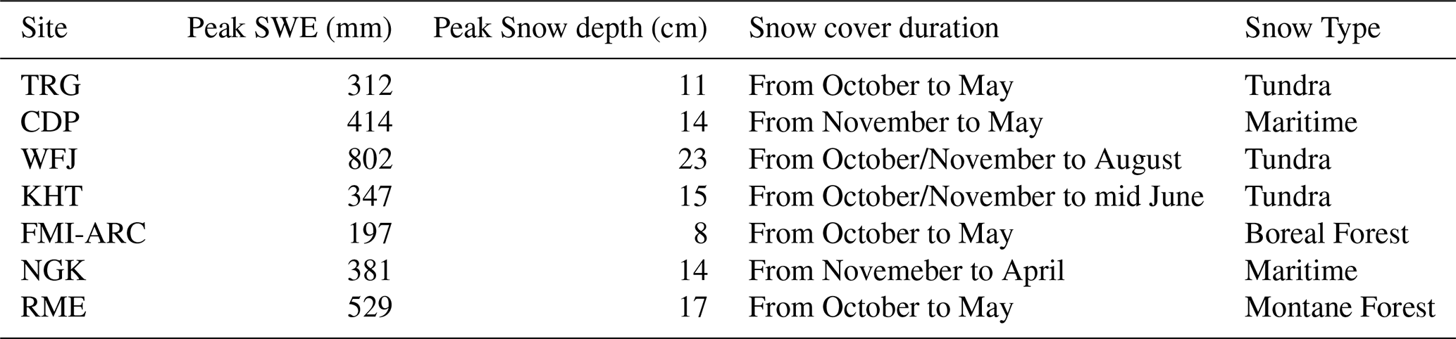 The sites were selected to ensure geographic and climatic diversity, spanning various regions that are exposed to a variety of snow climates (Sturm and Liston, 2021), (see Tables 1 and 2). The characteristics of the site vary widely, with elevations ranging from lowland areas such as Sodankylä (179 m) to high alpine environments such as Weissfluhjoch (2540 m). Annual and winter precipitation varies significantly across different locations, ranging from relatively dry areas like Torgnon, with an annual average of 794 mm, to much wetter regions such as Nagaoka, which receives 2773 mm per year. For this comparative analysis, winter is defined as the meteorological winter in the northern Hemisphere, spanning the months of December through February. Air temperature ranges reflect this environmental diversity, encompassing cold alpine regions, temperate meadows, and wetlands.