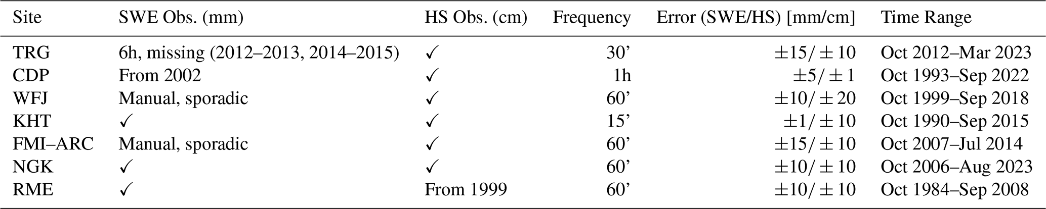 The record period for each dataset varied depending on the timeframes available at each site. To ensure uniform application of the algorithm, all datasets were resampled to a 1 h frequency using linear interpolation. This hourly resolution resolves day-night cycles of melting and refreezing, revealing air temperature fluctuations and their relationship with snowpack outflow. In addition, it enables the evaluation of the precipitation dynamics, the primary mass input to the seasonal snowpack (Avanzi et al., 2014).