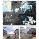 Figure 1Location of Queshque Glacier on base imagery from 2023 (Sentinel 2). The position of calving fronts in 2018 and 2020 (derived from Sentinel 2 imagery) also shown. Inset basemap courtesy of ESRI (a). Field photos from 2008 (b) and 2023 (c) are marked with stable reference points for comparison. Note that the 2008 glacier outline delineates only ice that was considered in our model, excluding other glaciers that existed at the time.