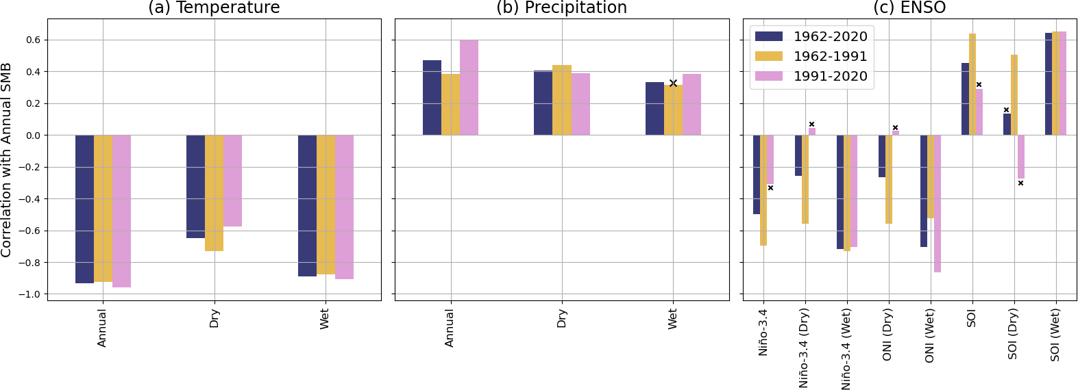 Figure 2Correlations for annual, dry-season (JJA), and wet-season (DJF) detrended temperature (a), precipitation (b), and ENSO indices (c) with the detrended annual SMB ensemble mean. Insignificant correlations (p>0.05) are marked by crosses.