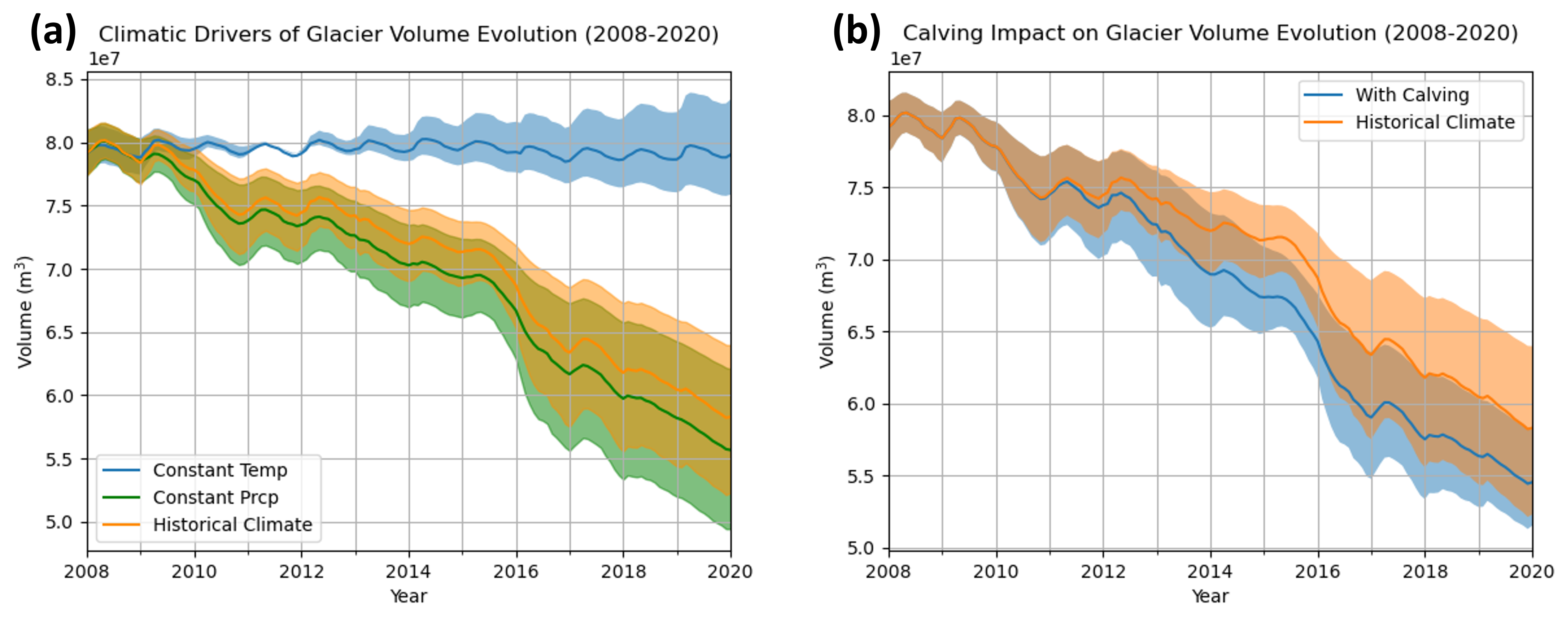 Figure 4Comparison of dynamic glacier evolution under the historical climate, constant climatological mean temperature, and constant climatological mean precipitation (a). Comparison of glacier evolution under the historical climate conditions with and without including frontal ablation (b). Solid lines represent ensemble mean values and shaded regions indicate the ensemble spread.