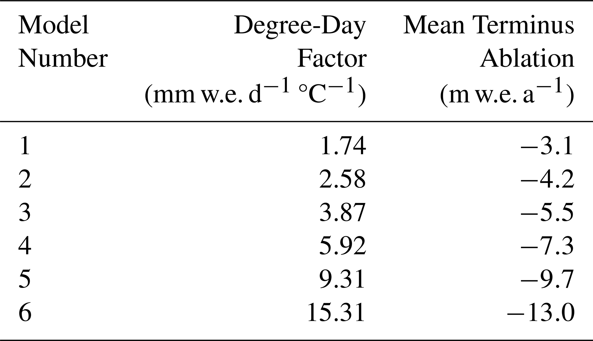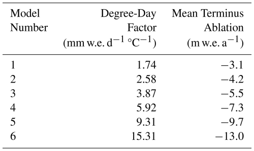 Table 3Mean annual ablation produced by each model at the lowest altitudes (4727–4800 m) during the years 2015–2019 which coincide with the timespan of in-situ mass balance measurements. The degree-day factors are included for reference.