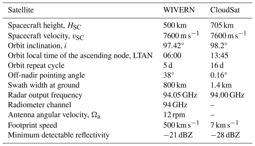 Table 1WIVERN and CloudSat (Stephens et al., 2002) orbit and radar specifics. The shown configuration of WIVERN is the one currently under Phase A study for the ESA Earth Explorer 11 programme.