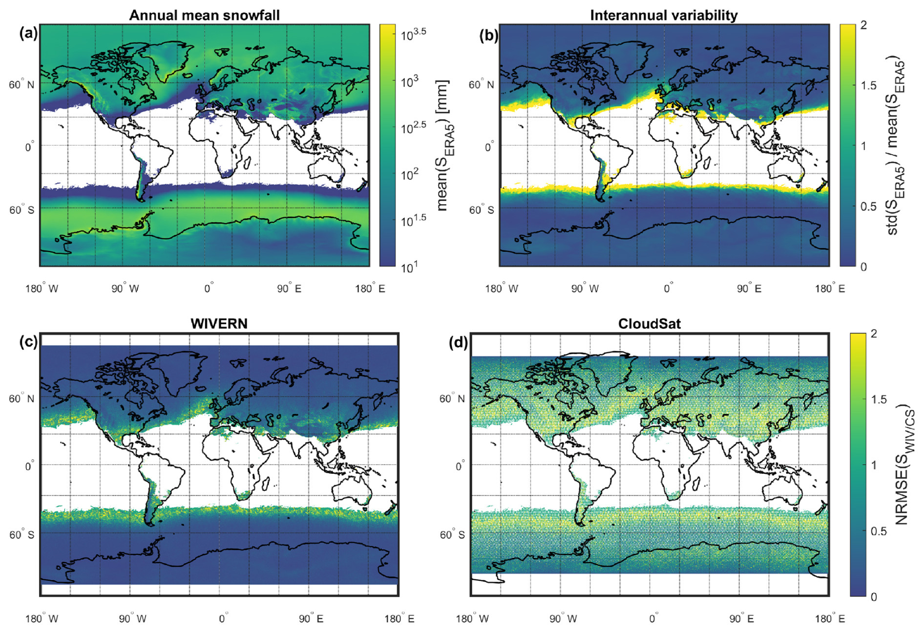 Figure 3Panel (a) shows the mean annual accumulated snowfall according to ERA5 from 2001 to 2020. Panel (b) shows the normalized standard deviation, hence the inter-annual variability in the snowfall. The corresponding normalized root mean square error in the 1-year accumulated snowfall sampled by WIVERN and CloudSat is also shown in panels (c) and (d), respectively.