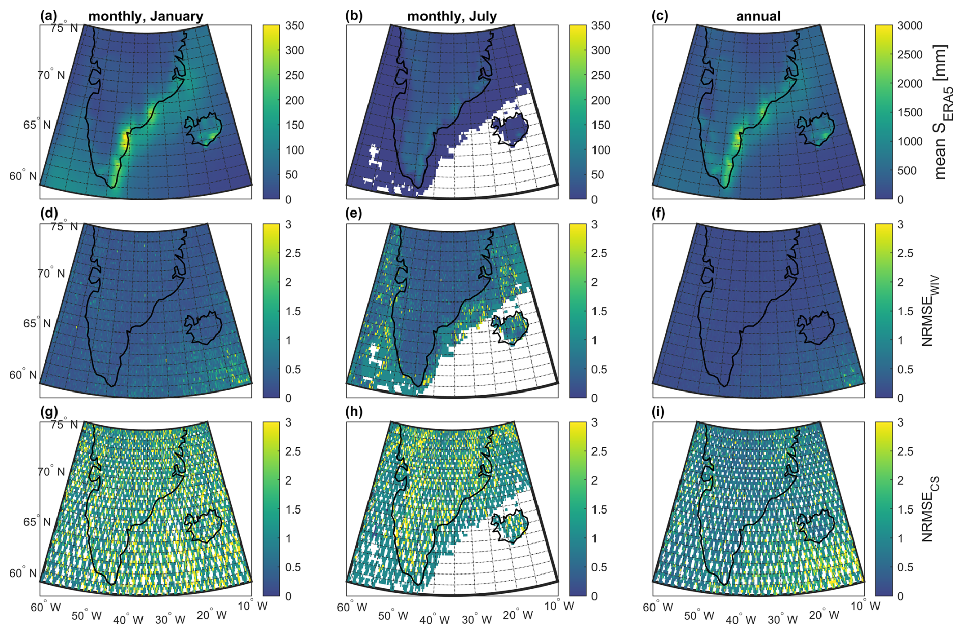 Figure 11Panels (a)–(c) show the mean monthly and annual snowfall on Greenland and Iceland according to ERA5 on a lat–long grid with box sizes of 0.25° × 0.25°. Panels (d)–(f) and (g)–(i) show the corresponding NRMSE of WIVERN and CloudSat, respectively. Note that, in July, the snowfall on the points above the ocean is very low and is characterized by very weak or very rare snowfall events, which cause the NRMSE to be ∼ 1 for WIVERN and CloudSat.