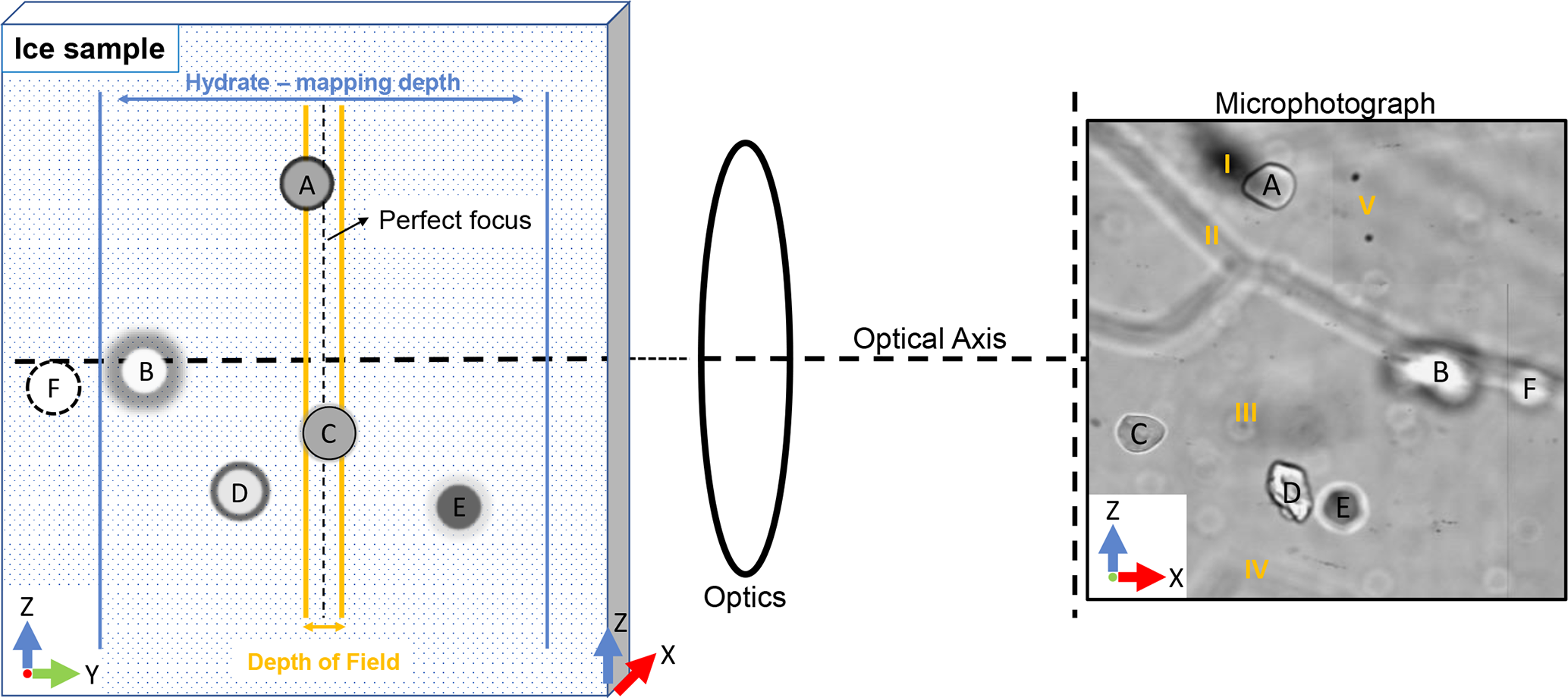 Figure 1This figure (“horizontal microscope”) shows the different visual categories (A–F) of air hydrates present in the image dataset, which depend on their relation to the focus plane and on other optical features (I–V). The Z axis is parallel to the core axis and points towards the “top” direction.
