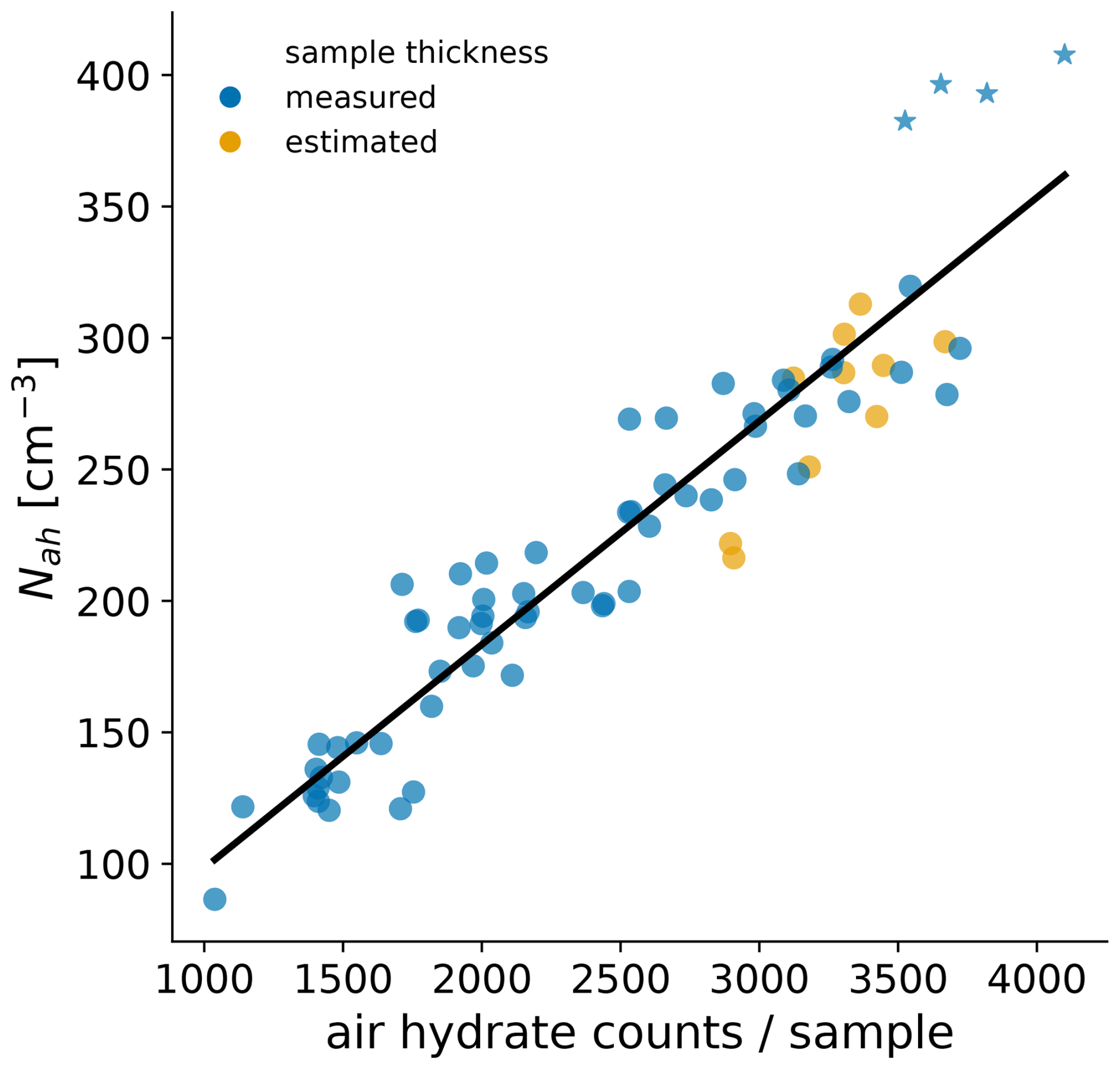 We convert the measured air hydrate counts per sample to Nah using the measured ice-sample thickness (mean value of six consecutive measurements, typically 4.53±0.49 mm) and the cropped mosaic image dimensions (80 mm×30 mm). Air hydrate counts per sample and Nah have a good linear correlation (Fig. 4), and we conclude that the observed volume (i.e., hydrate-mapping depth; Fig. 1) is consistent for all samples. An exception could be the samples from 1255–1294 m (star markers in Fig. 4).