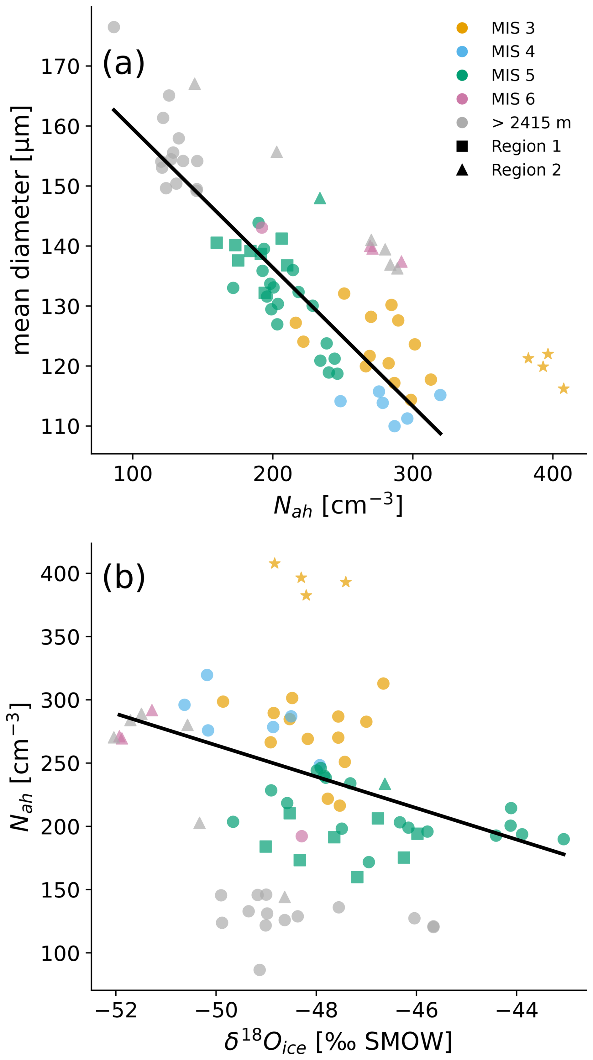 The main results, together with the stable water isotope () record (EPICA Community Members, 2010; Oerter et al., 2025), a proxy for past climate and particularly past temperature, and the ice crystal grain size (Weikusat et al., 2009), are presented in Fig. 5. Nah decreases from about 400 cm−3 at 1255 m to about 120 cm−3 at 2771 m, with fluctuations that broadly match the δ18O signal (Fig. 5a and b). The lowest Nah of the record is 90 cm−3 and occurs at 2741 m. We measure an average Nah of 290 cm−3 during the cold periods of MIS 4 and MIS 6, which is higher than the Nah during the warmer Eemian (MIS 5e), where the average value is 190 cm−3. Surprisingly, no air hydrates were found in the lowermost sample at 2773.91 m depth. The sizes of the air hydrates in all samples, except possibly at 2545 and 2741 m depth, follow a log-normal distribution. Consequently, we determined the arithmetic mean diameter () and standard deviation (σ) by fitting a log-normal function. The values for the air hydrate mean diameter range from 110 to 176 µm (Fig. 5c). Generally, air hydrates are smaller during colder periods, with a mean value of 113 µm for MIS 4, and bigger during warmer periods, with a mean value of 140 µm for MIS 5e. Close to the bottom of the ice core, the mean diameter increases to a maximum of 176 µm. The width of the air hydrate size distributions, given here as the relative standard deviations (RSDs; ), range from 33 % to 48 % (Fig. 5c). These values are nearly identical to those measured in the Vostok (Lipenkov, 2000) and Dome Fuji (Uchida et al., 2011) ice cores. From 1255 to 1635 m depth, the average RSD is 40 %, and, from 1635 m, it decreases to an average of 37 %. An exception is samples from ca. 1995 to 2115 m depth, where the RSD increases with a maximum of 43 % at ca. 2040 m. Furthermore, at the Eemian–MIS 6 transition, the RSD increases from 37 % to 43 %. Naturally, Nah and mean diameter show a strong negative linear correlation (Fig. 6a); however, 10 anomalies (triangular markers) can be found for samples from 2382–2545 m depth (excluding the sample at 2385 m), where either Nah or is overestimated. These samples correspond to “region 2” in the following figures and will be discussed in more detail below.