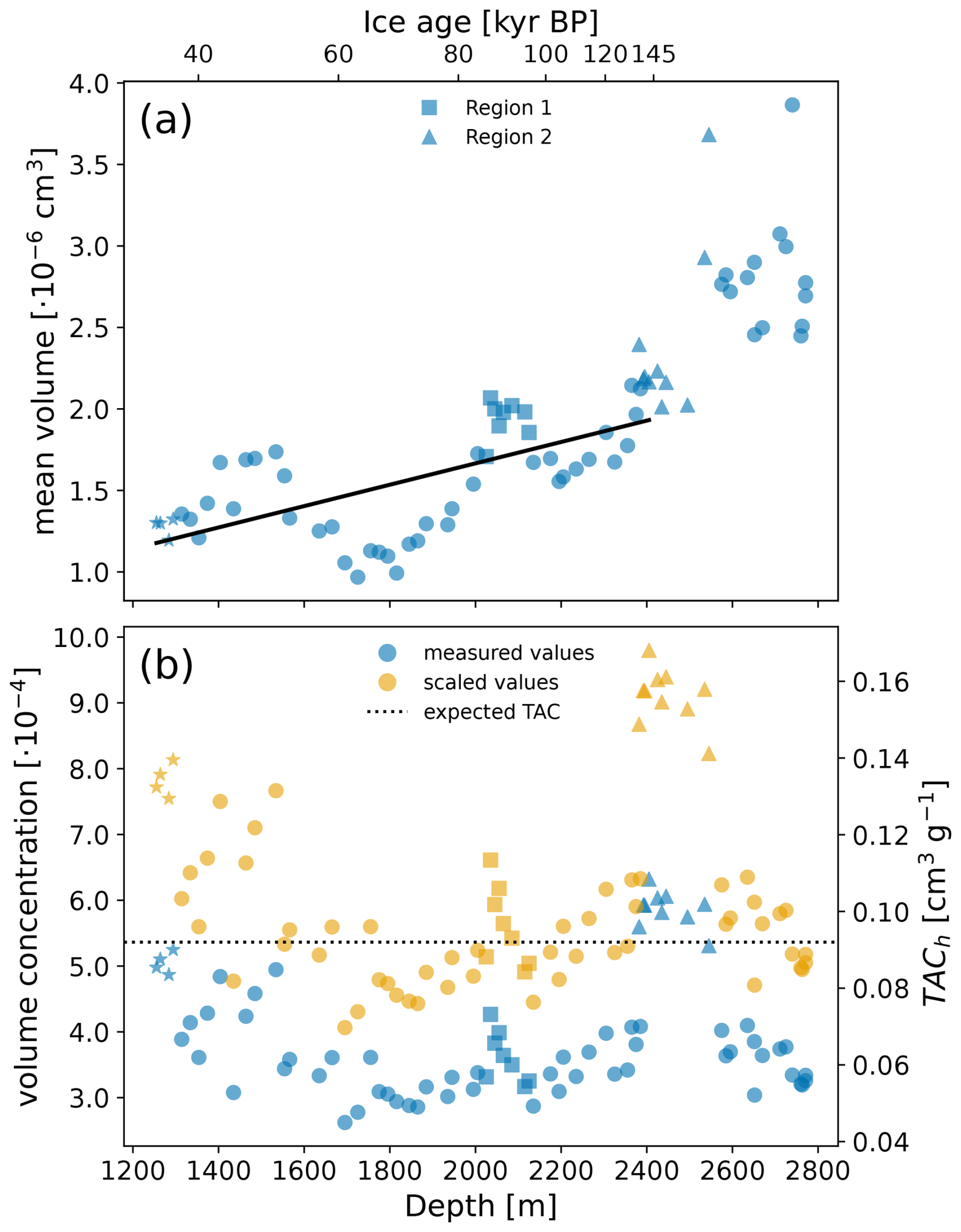 Figure 7(a) Air hydrate mean volume. The solid line represents the calculated growth rate for the dated part of the EDML ice core (1255–2415 m; Ruth et al., 2007). (b) Blue markers: air hydrate volume concentration and total air content calculated from theoretical air content of air hydrates. Orange markers: scaled values to match expected mean TAC for EDML (dotted line at 0.092 cm3 g−1; Martinerie et al., 1992). Star markers correspond to samples from 1255–1294 m depth. Square markers correspond to samples from 2025–2115 m depth (region 1 in Figs. 5 and 8). Triangular markers correspond to samples from 2382–2545 m depth (region 2 in Figs. 5 and 8). The ice age at the top of the figure corresponds to the AICC 2023 for EDML (Bouchet et al., 2023).