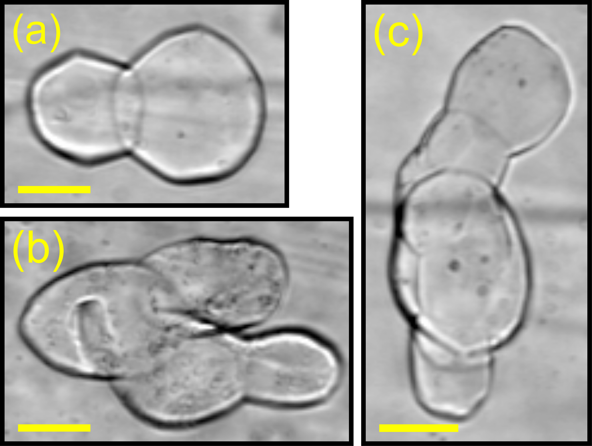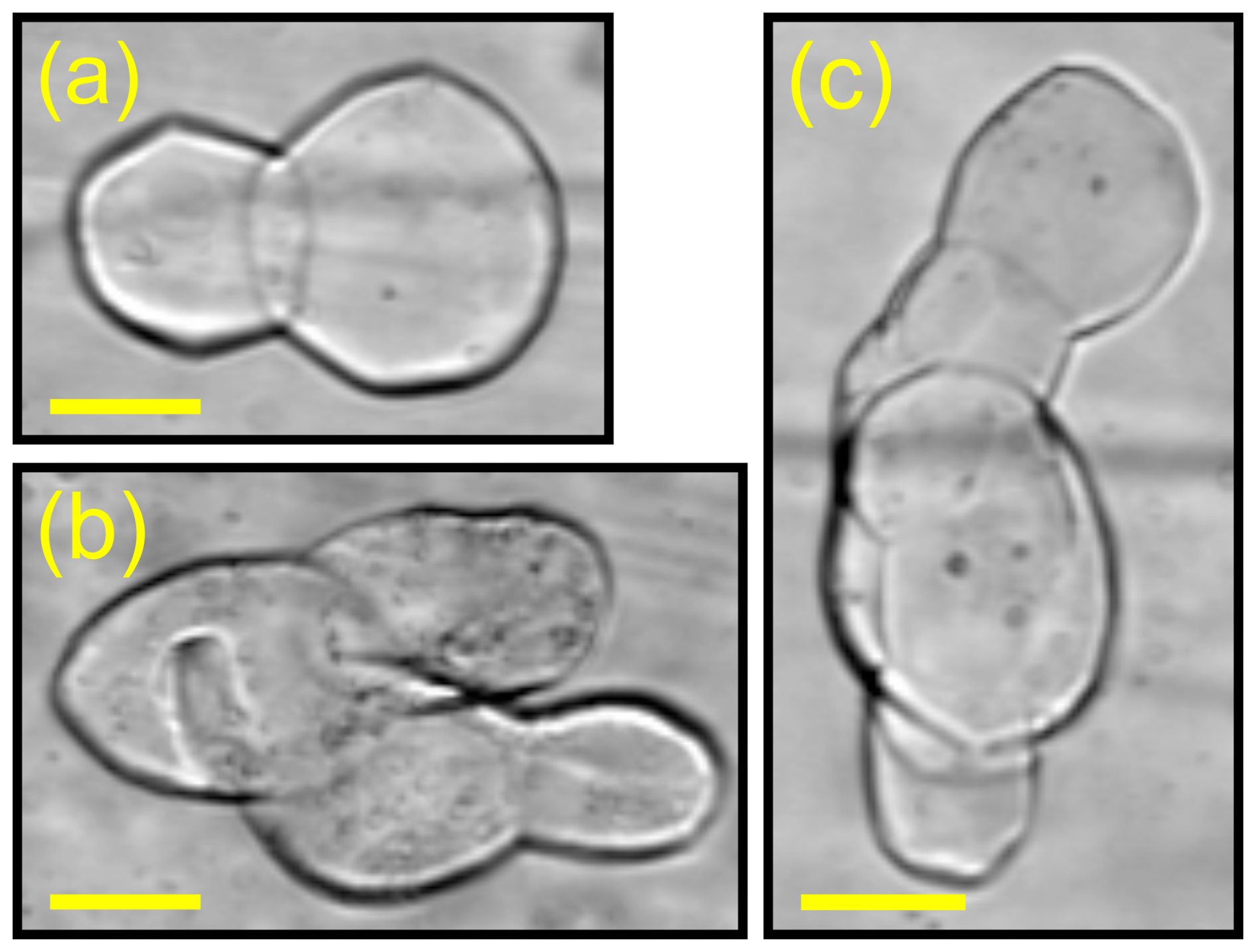 Figure 10Example of clustered air hydrates in the sample from 2405 m depth. Scale bars correspond to 100 µm. Panel (a) represents a “simple” clustered air hydrate, and panels (b) and (c) represent “multi” clustered air hydrates. The equivalent-circle diameter for panels (a–c) is 257, 299, and 296 µm, respectively, which is about 2 times the samples (137 µm).